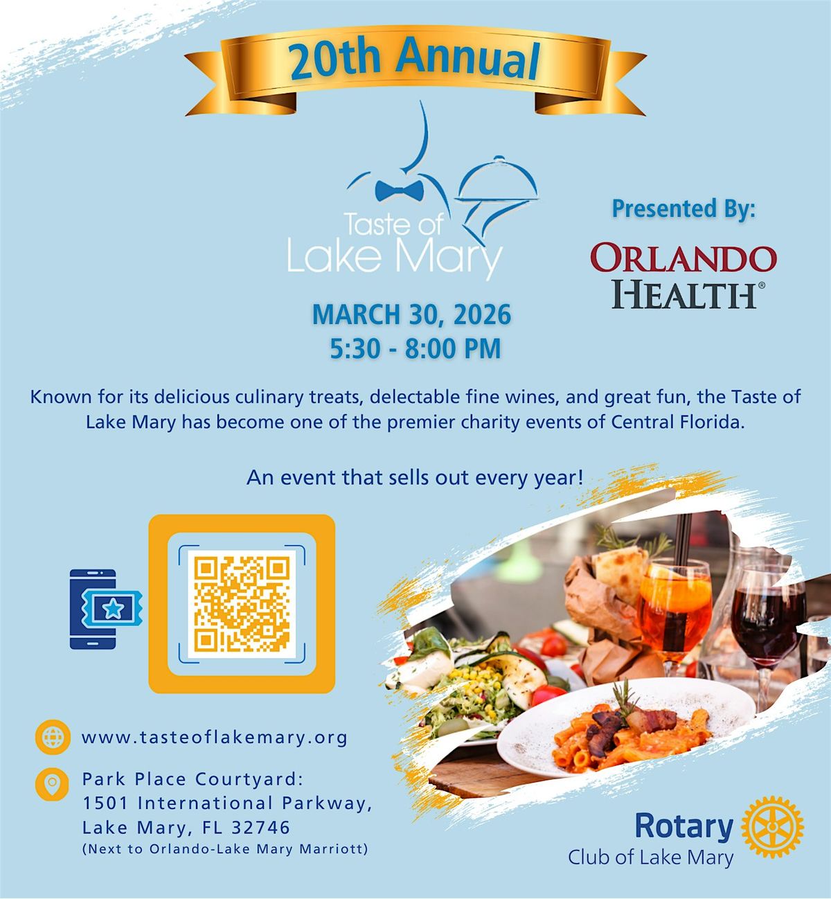 The Rotary Club of Lake Mary is excited to announce the 20th Annual "Taste of Lake Mary," which will take place in the beautiful courtyard between the Lake Mary Marriott and the Park Place at Heathrow. This event features over 25 local restaurants, top chefs, bakers, caterers, and beverage purveyors, all set for a fun evening filled with live music.