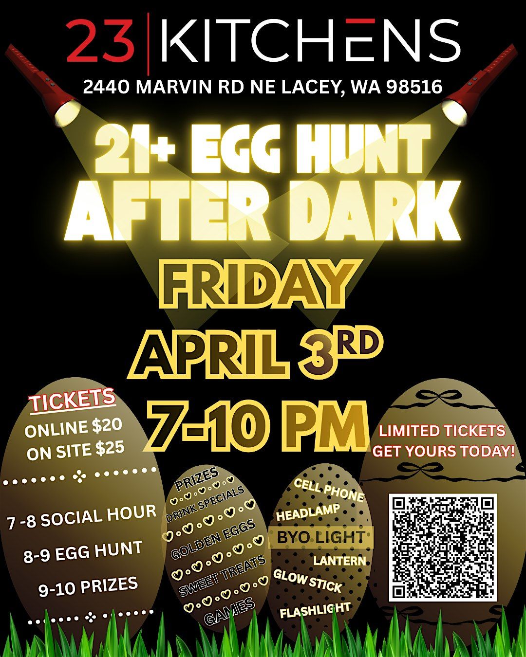Get ready for a fun and unique twist on the classic egg hunt! Join us at 23 Kitchens on April 3, 2026 at 7:00 PM (Pacific Time) for an evening filled with surprises, great vibes, and a chance to find some hidden treasures—all for those 21 and older. Bring your friends and enjoy a night of laughter and excitement in a cool, relaxed setting. Don’t miss out on this after-dark adventure!