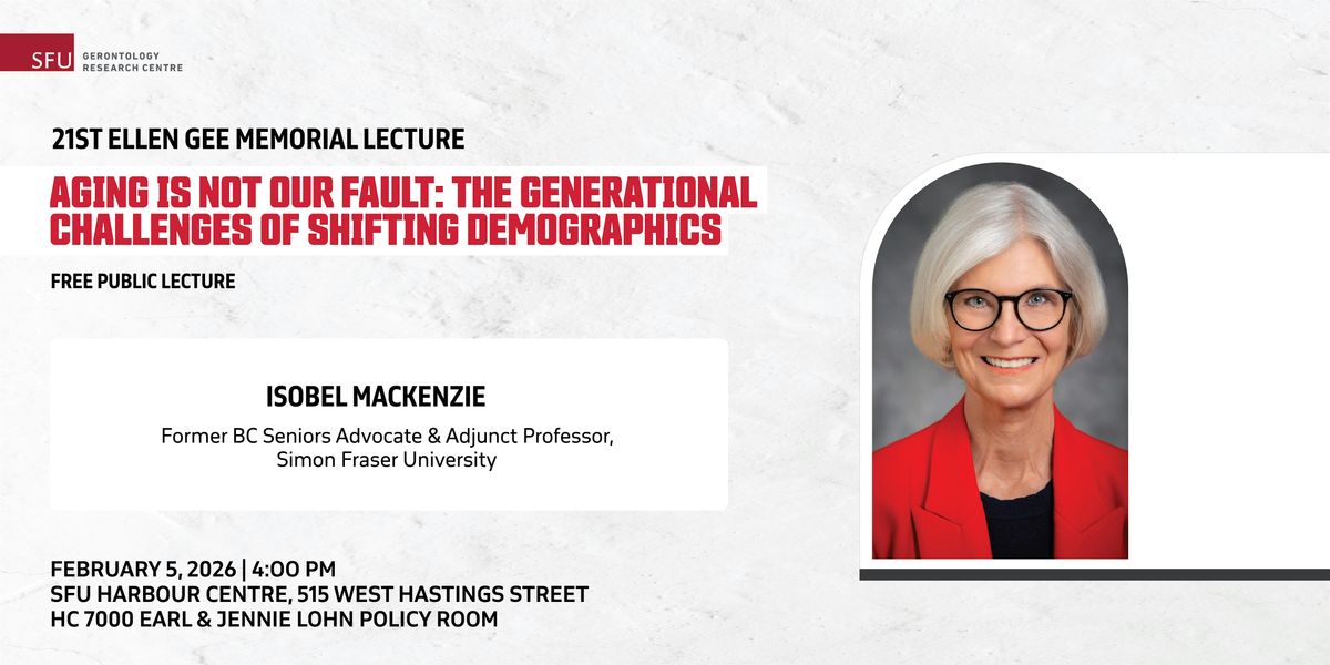 Simon Fraser University's Gerontology Research Centre invites you to the 21st Ellen Gee Memorial Lecture featuring Isobel Mackenzie. This event will take place on Thursday, February 5, 2026, from 4:00 pm - 6:30 pm (PT) at SFU's Harbour Centre Campus in room HC 7000 (Earl & Jennie Lohn Policy Room).