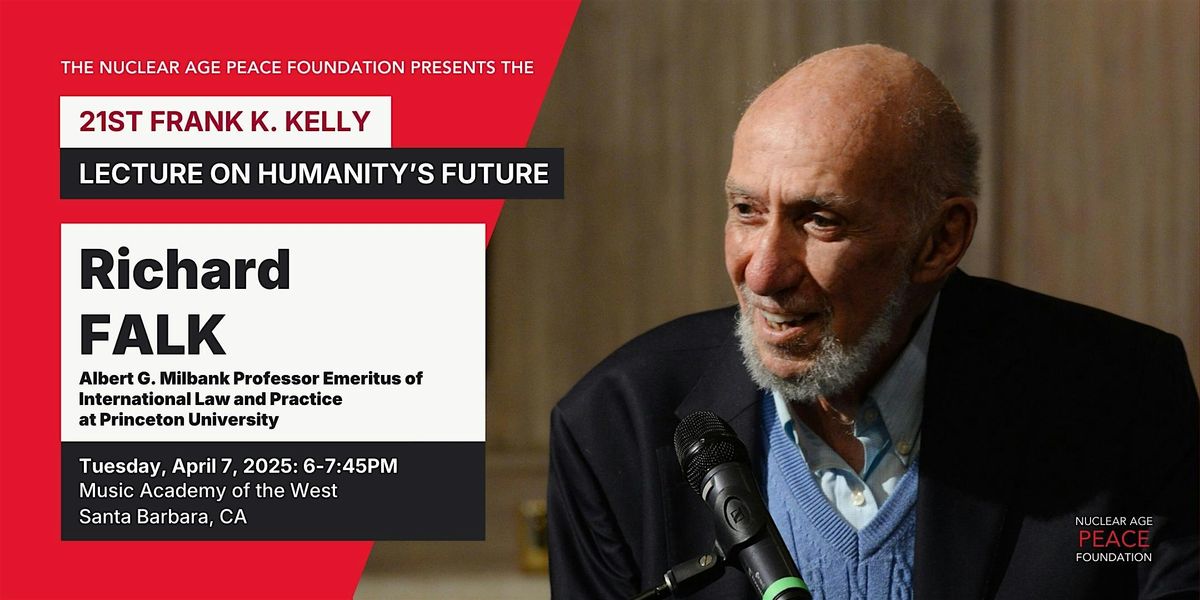 The 21st Frank K. Kelly Lecture on Humanity’s Future will take place at the Music Academy of the West in Santa Barbara and will be delivered by Professor Richard Falk, one of the world’s leading scholars of international law and global governance. Hosted by the Nuclear Age Peace Foundation, the lecture continues a long-standing tradition honoring the legacy of Frank K. Kelly by inviting distinguished voices to reflect on humanity’s most pressing challenges.