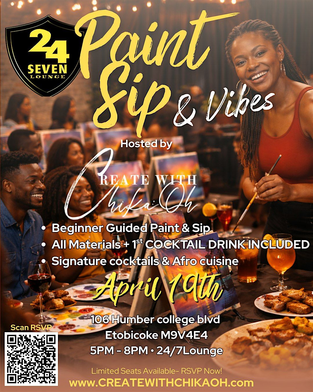 Join us for a vibrant Paint and Sip Night at 24/7 Lounge from 5 PM to 8 PM April 19th 2026, an immersive Afro-inspired creative experience hosted by a talented Black female artist. Enjoy a guided painting session while sipping on signature cocktails and indulging in flavorful Afro cuisine in a warm, upscale lounge setting.