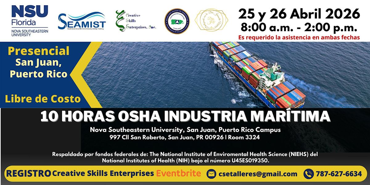 Incluye: estacionamiento, material didáctico digital, la tarjeta de OSHA (DOL Card) y el Certificado de participación del Instituto de Preparación para Desastre y Emergencias de la Facultad de Medicina Osteopática Dr. Kiran C. Patel de Nova Southeastern University en Florida, Estados Unidos. Al completar el curso estarán autorizados por el Departamento de Salud y Seguridad Ocupacional de Estados Unidos para realizar funciones de operación en la industria marítima.