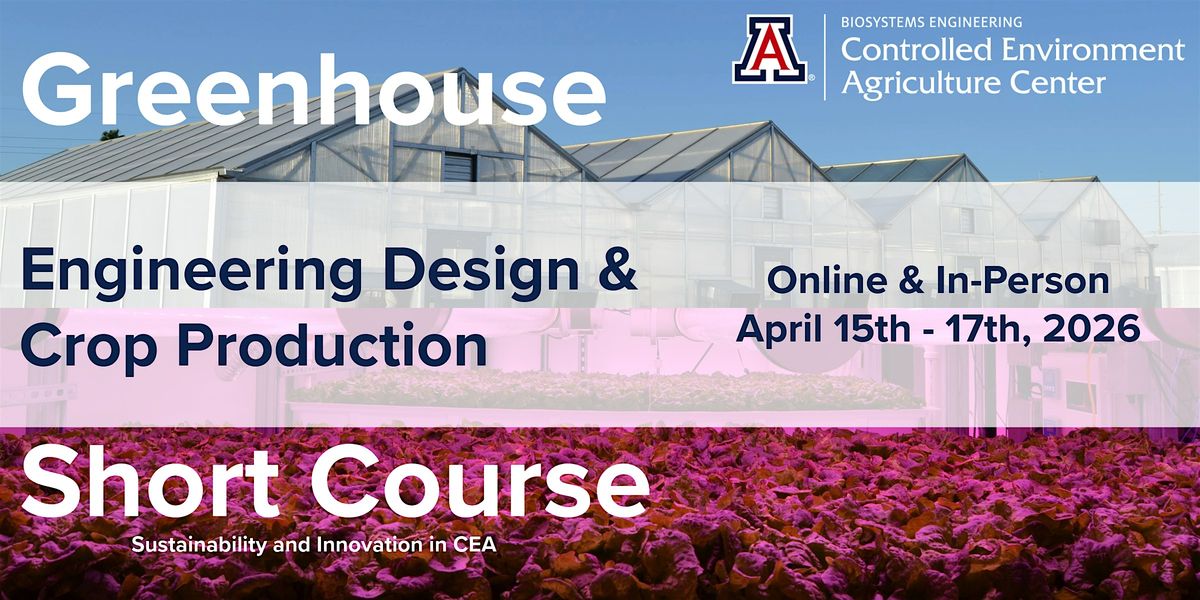Get your questions answered and increase your knowledge in controlled environment agriculture and hydroponic growing at the 25th annual Greenhouse Crop Production & Engineering Design Short Course – A three-day online and onsite conference put on by the University of Arizona's Controlled Environment Agriculture Center that will consist of lectures presented by leaders in academia and in the CEA industry. The event will be located at the University of Arizona's Controlled Environment Agriculture Center (CEAC). *Limited in-person seating*