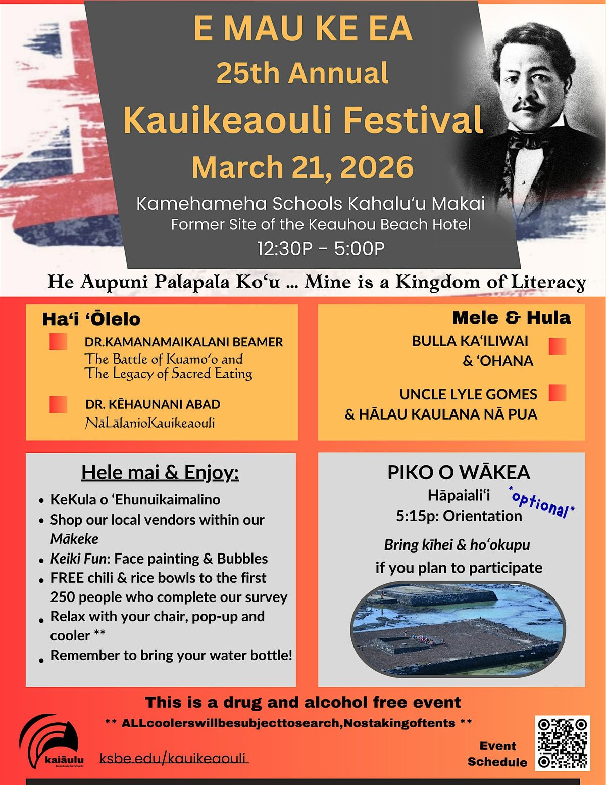 This event honors Ka Lani Kauikeaouli, Kamehameha III and his dedication to literacy and education. Free chili and rice bowls for the first 250 people. Bring your own folding beach chair, umbrella, and refillable water bottle. Free entertainment, speakers, marketplace. Optional activity: Piko O Wākea Spring Equinox at Hāpaialiʻi Heiau at sunset.