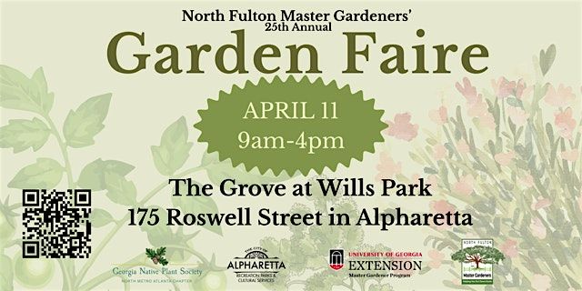 Welcome to the April 11, 2026 North Fulton Master Gardener 25th Annual Garden Faire! Join us at The Grove at Wills Park on Sat, Apr 11, 2026, 9:00 AM until 4:00 PM. Get ready for a day filled with our Master Gardeners' Passalong Plant Sale, Expert Advice from your Local Master Gardener Team, Two Curated Educational Garden Talks--on Topics You Have Asked for (these Talks are Free, but Please Register in Advance), Plant Sales by Georgia Native Plant Society and the Alpharetta Community Agriculture Program/Old Rucker Farm, and fun activities for all ages. Whether you're a seasoned gardener or just starting out, this event is perfect for anyone who loves gardening. Don't miss out on this community-focused opportunity to shop for a variety of plants and nature-inspired gardenware(pottery, birdhouses, plants, jewelry, seeds, plants, vintage garden decor). A great opportunity to connect with fellow garden enthusiasts. We can't wait to see you there!!! P.S. We'll have food and live music, too!!!