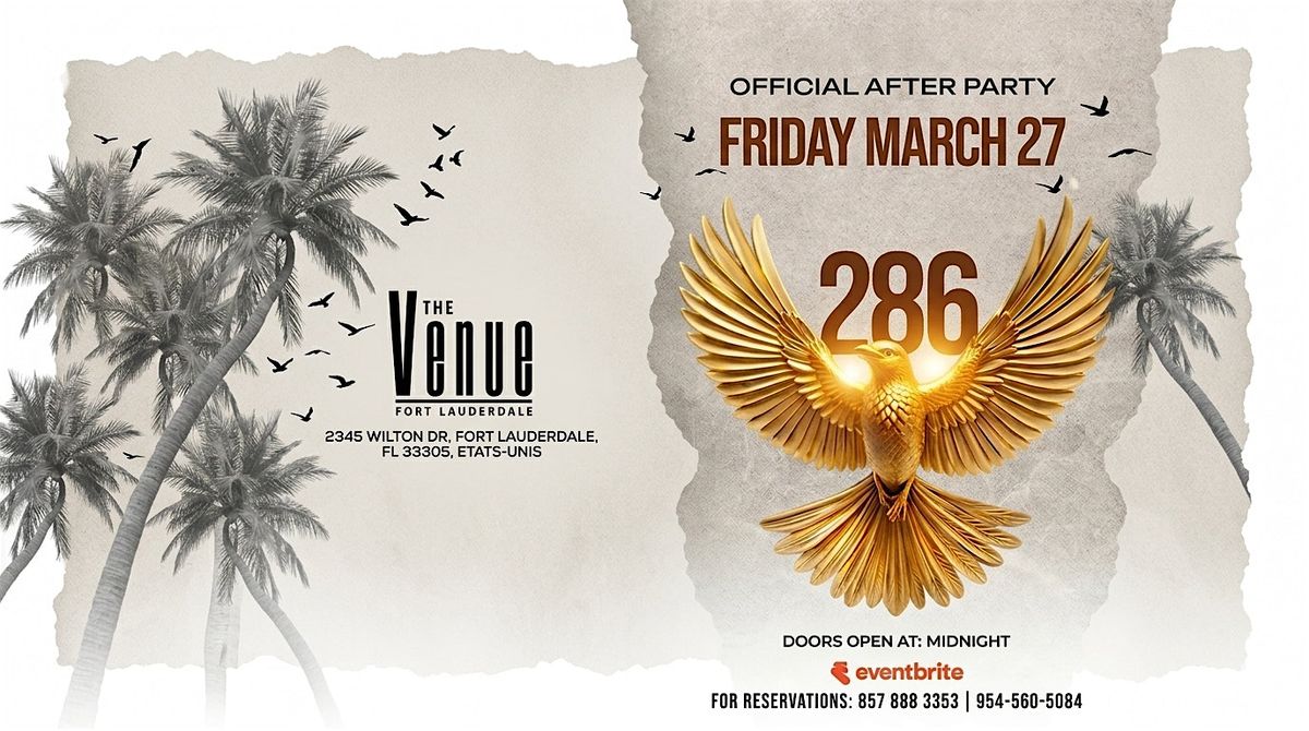 Get ready to keep the vibes going at the 286 OFFICIAL AFTER PARTY! Join us at The Venue Fort Lauderdale on March 27, 2026 at MIDNIGHT (Eastern Time). Come meet the Artist. It’s the perfect spot to chill, dance, and celebrate with friends after the main event. Don’t miss out on an epic night full of good music and great company.