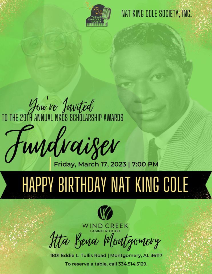 Our 29th Nat King Cole Society, Inc. Annual Scholarship Awards Fundraiser will be held at Itta Bena Montgomery on Friday, March 17, 2023 at 7:00 p.m. To book a table at Itta Bena Montgomery, visit https://windcreek.com/montgomery/dining/book-an-event or dial 334.514.5129. We would greatly appreciate your presence and support. The Nat King Cole Society, Inc. will be awarding scholarships in Nat King Cole’s honor to outstanding Montgomery County public school students attending Alabama State University and enrolled in its Departments of Music and Theatre Arts. The scholarships themselves and the criteria for receiving them were established and carefully nurtured by Society Founder Amos Harris. The Society is very appreciative of your generosity, and we hope that you will continue your support with a tax-deductible contribution to the scholarship fund. Simply send your contribution to the Nat King Cole Society, Inc., a 501c(3) non-profit organization, via our GoFundMe page: https://gofund.me/22c4ff36 or mail to Post Office Box 1687, Montgomery, AL 36104. We look forward to your support which will help us memorialize Nat King Cole’s unmatched accomplishments and extend his legacy to future generations.