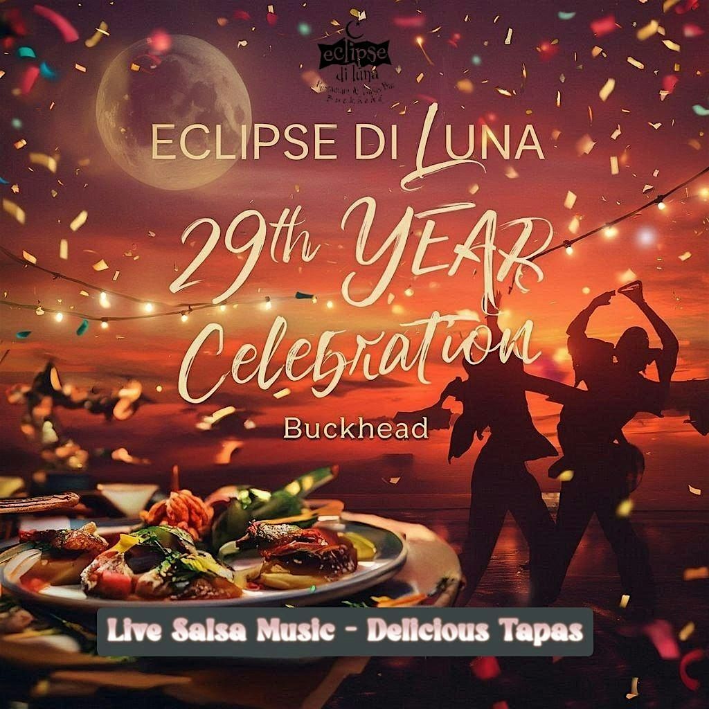 Celebrate the 29th spectacular year at Eclipse di Luna in Buckhead! Atlanta's iconic Spanish tapas bar delivers bold flavors, vibrant energy, and sizzling live salsa music. Step into a night of pure pasión española: bold, sizzling flavors exploding on every plate, electric live salsa music that gets your hips moving, and the kind of vibrant energy that only Atlanta's iconic Eclipse di Luna can deliver. Laughter, clinking glasses, and unforgettable moments await!