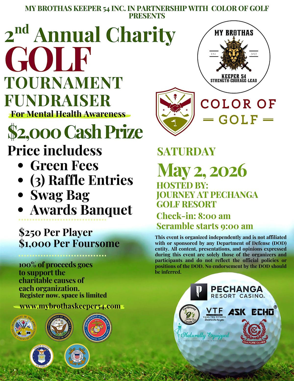 Join us for a powerful day of community, compassion, and connection at the stunning Journey at Pechanga golf course. This isn't just a tournament, it's a movement to honor and uplift our veterans and first responders, whose courage and service deserve more than gratitude. They deserve healing, support, and hope.
