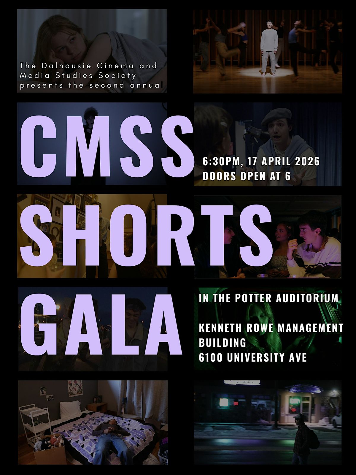 We'll be showcasing eleven student produced films starting at 6:30, with a fifteen-minute intermission at the halfway point. Doors open at 6, so you'll have time to take some photos, grab a snack, and find your seat! We will also host a Q&A with our directors after the screening. We'll be in the Potter Auditorium in the Kenneth C Rowe Management Building at Dalhousie University.