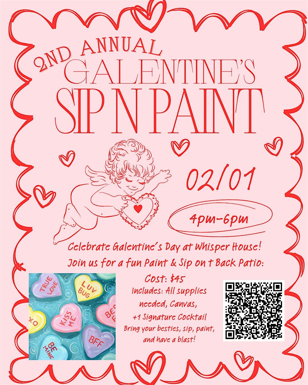 Welcome to the **Galentines Paint N Sip** at The Whisper House! Grab your gals and join us for a fun evening of painting and sipping on delicious drinks. Let your creativity flow as you create your masterpiece with the guidance of a talented artist. No experience necessary, just come ready to have a good time! The event will take place on **Sunday, Feb 01 2026** at **4:00 PM** at The Whisper House. Don't miss out on this opportunity to unwind and connect with your friends in a cozy and welcoming atmosphere. See you there!