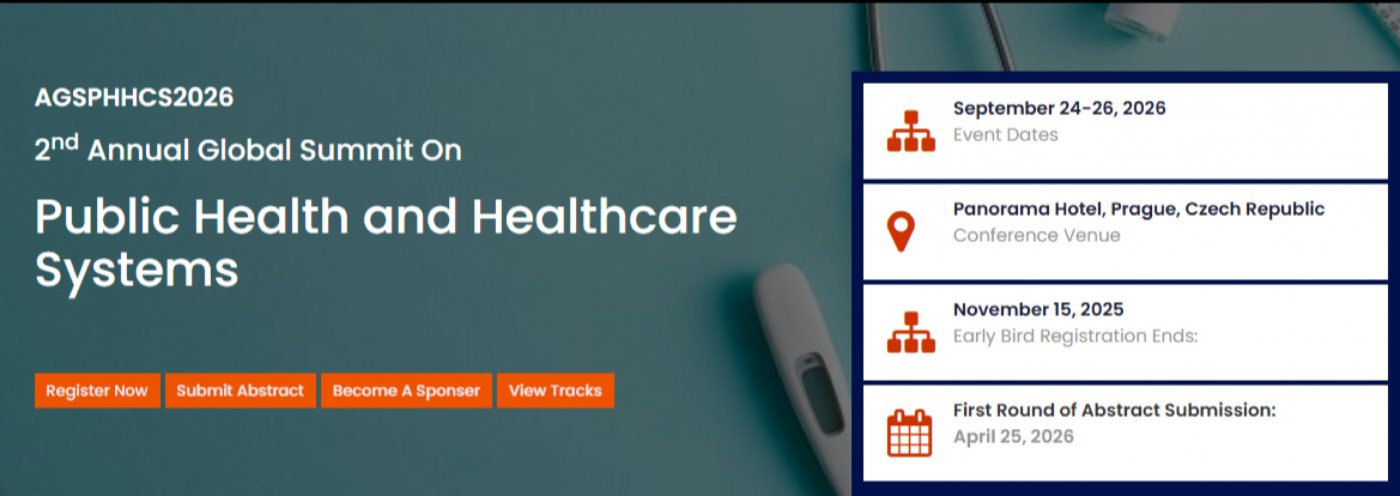 Join us in Prague, Czech Republic, for the 2nd Annual Global Summit on Public Health and Healthcare Systems (AGSPHHCS2026), taking place from September 24–26, 2026, at the Panorama Hotel.