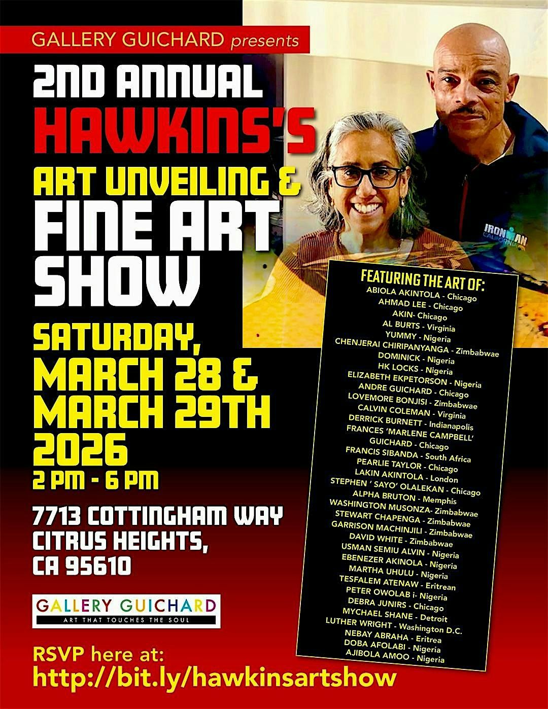Welcome art enthusiasts! 🎨 Join Gallery Guichard Fine Art Gallery from Chicago, IL. for the 2nd Annual Hawkins Art Unveilng & Fine Art Show in Citrus Heights, CA (7713 Cottinghan Way Citrus Heights, CA on Saturday, March 28 & Sunday, March 29, 2026 at 2:00 PM (Pacific Time). Get ready to immerse yourself in a world of original fine art, creativity and talent as we showcase stunning works of art from talented artists from all over the world. Don't miss this opportunity to experience the beauty and power of art in person. See you there!