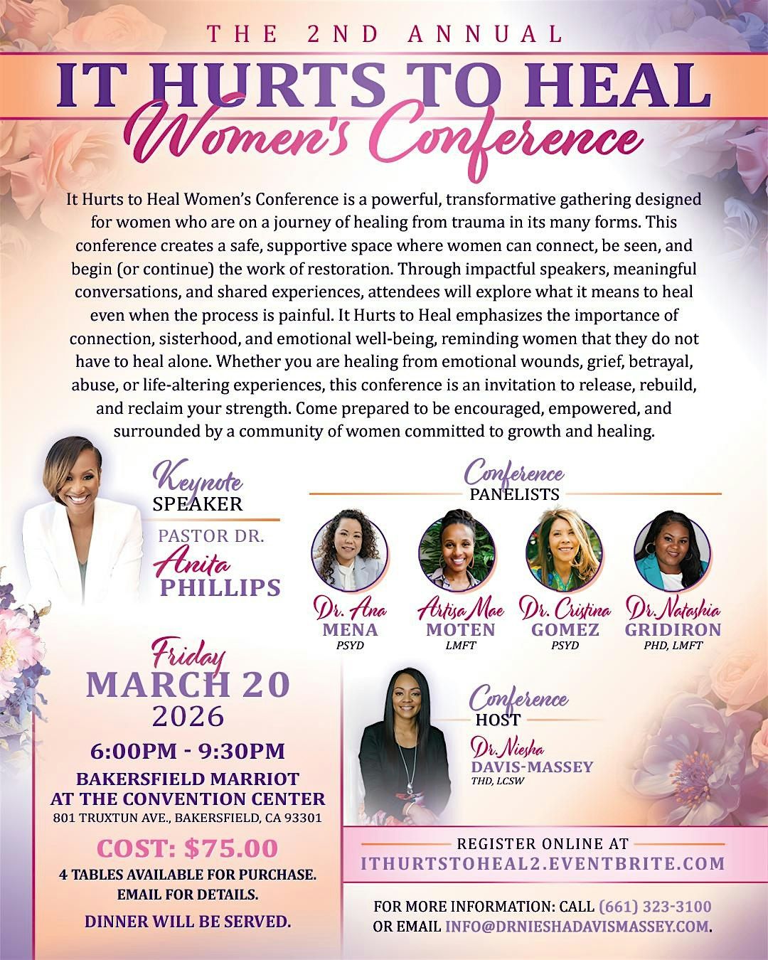 The 2nd Annual It Hurts to Heal Women’s Conference is a powerful, transformative gathering designed for women who are on a journey of healing from trauma in its many forms. This conference creates a safe, supportive space where women can connect, be seen, and begin (or continue) the work of restoration. Through impactful speakers, meaningful conversations, and shared experiences, attendees will explore what it means to heal even when the process is painful. It Hurts to Heal emphasizes the importance of connection, sisterhood, and emotional well-being, reminding women that they do not have to heal alone.Whether you are healing from emotional wounds, grief, betrayal, abuse, or life-altering experiences, this conference is an invitation to release, rebuild, and reclaim your strength. Come prepared to be encouraged, empowered, and surrounded by a community of women committed to growth and healing.