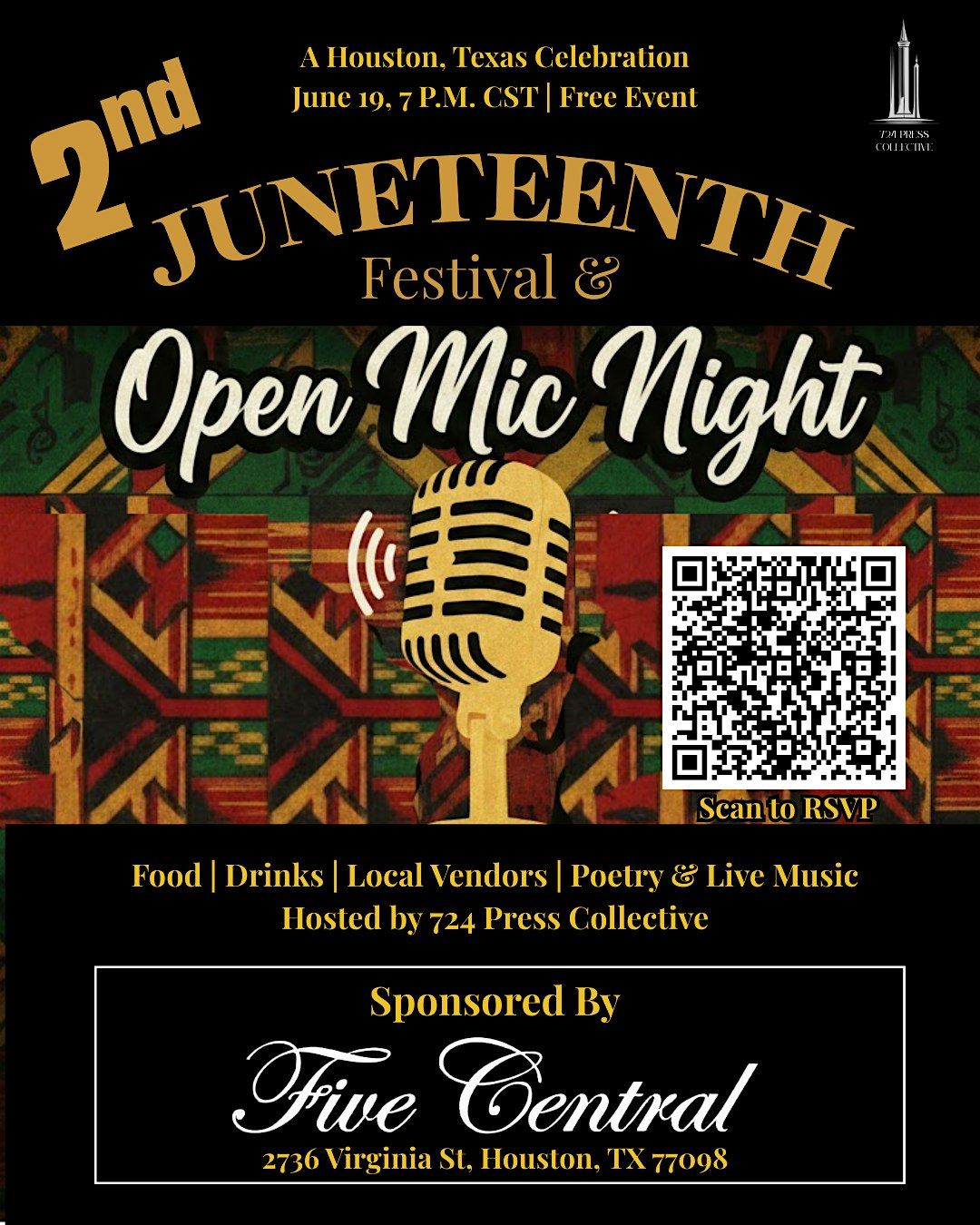 Join us for the 2nd Annual Roots & Rhythm: HTX Open Mic, hosted by 724 Press Collective at Five Central. This festival is an open poetry night honoring Juneteenth through powerful words, live performances, and local artistry.