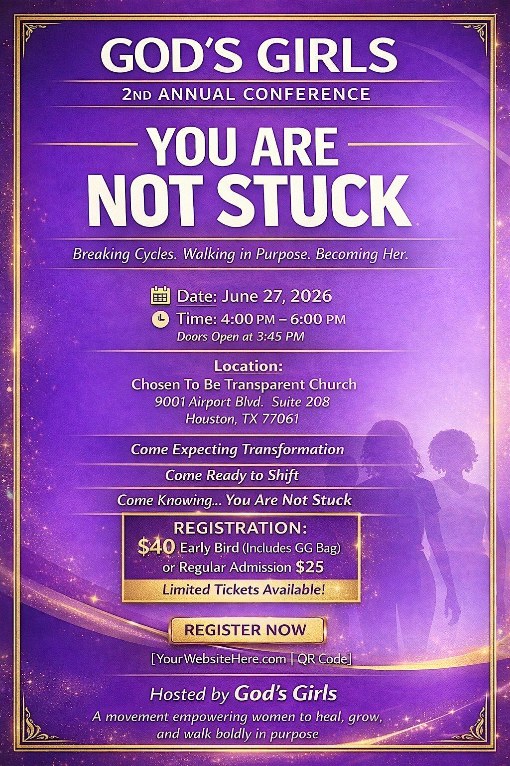 Are you ready for the most ultimate experience with God in Houston? Be prepared to break free from the ordinary, have fun , learn , laugh and step into your purpose. This powerful, unforgettable event.. filled with joy, connection, and real encounters with God. Learn from God’s Girls and how they grew in faith, released what’s been holding them back, and stepped boldly into who they are called to be.