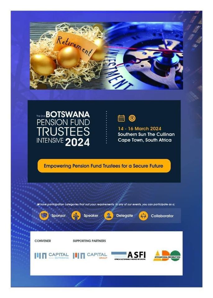 Join us at the 2nd Botswana Pension Fund Trustees Intensive, happening from March 14th to 16th, 2024, in Cape Town. Under the theme "Empowering Pension Fund Trustees for a Secure Future," this event promises a transformative experience.