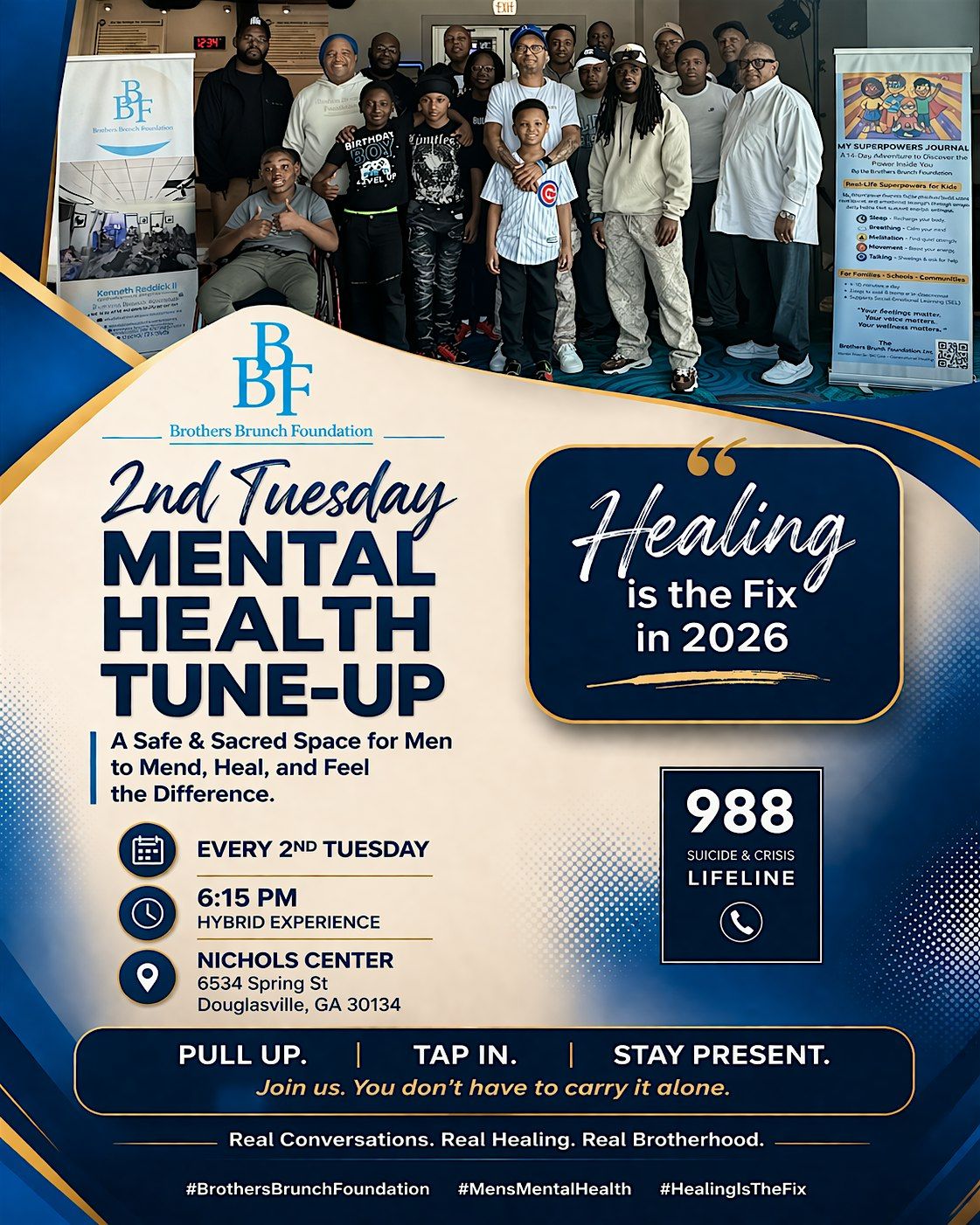 Life requires maintenance—and so does your mental health. The Tuesday Mental Health Tune-Up is a monthly fellowship held every 2nd Tuesday, created to give Black men a consistent space to pause, check in, and strengthen their mental and emotional wellbeing.