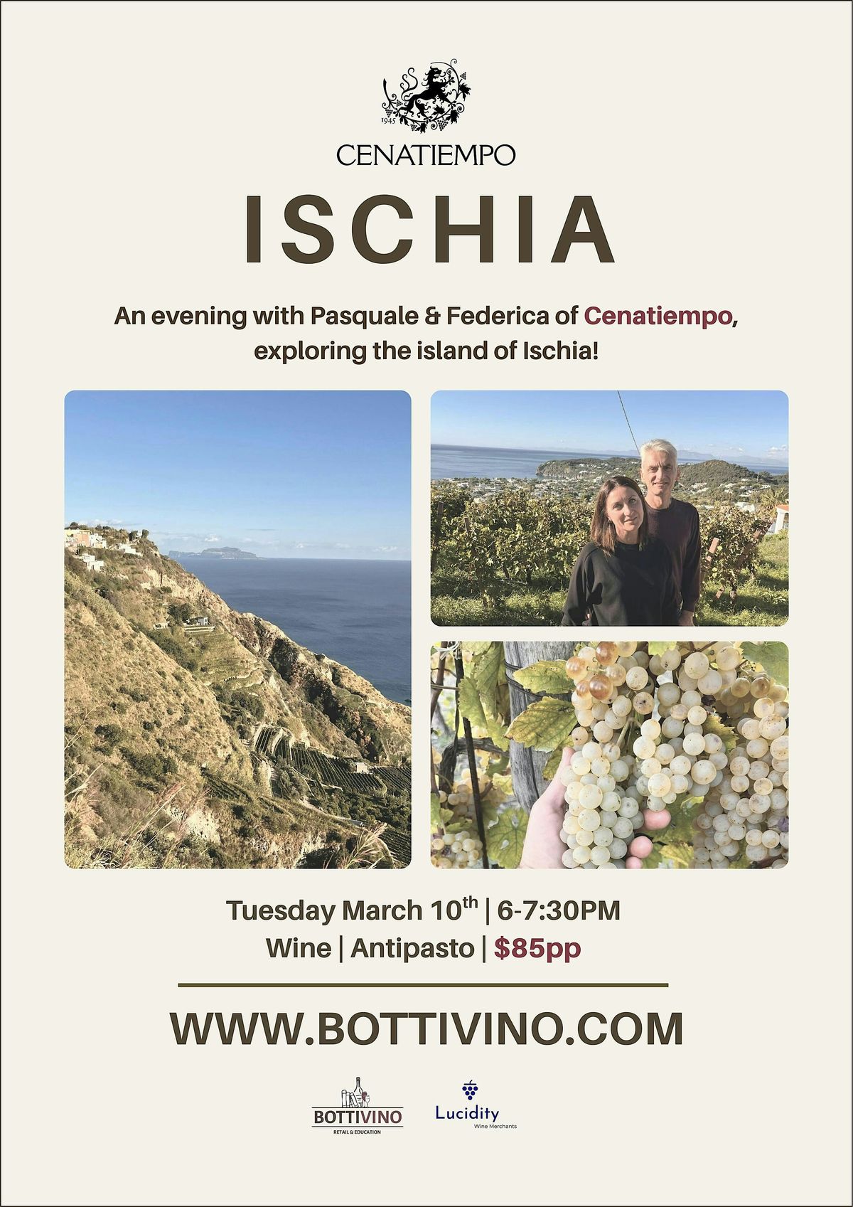 Join us for an immersive tasting experience into the wines of Ischia through the lens of the iconic producer Cenatiempo! On the evening of March 10th, I welcome Pasquale Cenatiempo and his partner, Federica Predoni, for an exploration of this region through their incredible portfolio of wines. We will cover the ancient history of Ischia and some of its treasures, while noshing on a giant spread of antipasto + bites inspired by this remote Mediterranean island! Join us around the table where the education is truly found, in the glass!