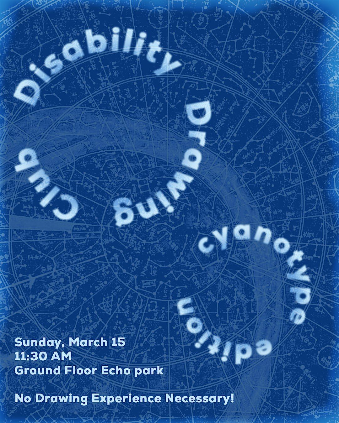 Header Image Description: A blue-toned poster featuring a circular star chart background. On top, a circular ring of light blue and white text says “Disability Drawing Club.” A slightly smaller ring in the same color says "cyanotype edition." In the lower-left corner, light blue text provides event details: “Sunday, March 15, 11:30 AM, Ground Floor Echo Park. No Drawing Experience Necessary!”