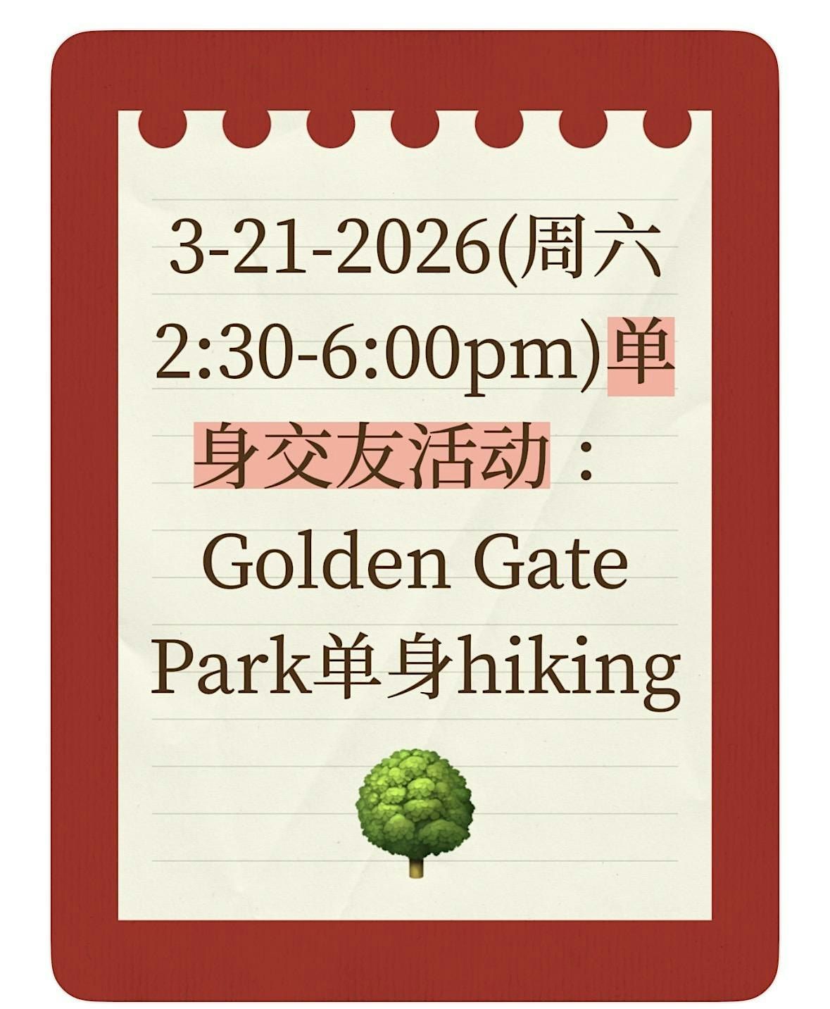3-21-2026(周六2:30-6:00pm)单身交友活动 :Golden Gate Park单身hiking(Golden Gate Park Perimeter Loop )。本次活动仅限单身人员