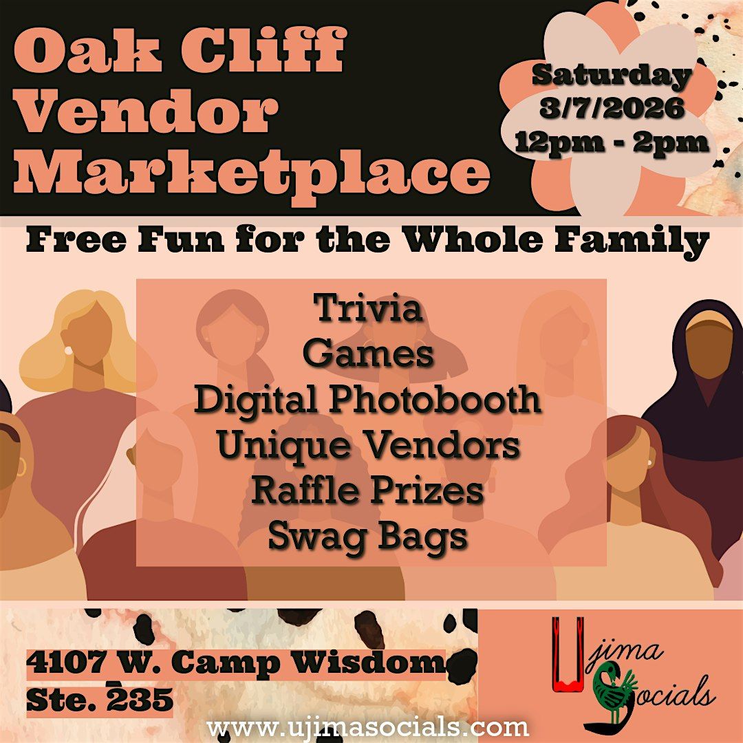 Come join us for a fun-filled Oak Cliff Vendor Marketplace event on March 7th! Our theme this month is Women's History. This free event will be held at 4107 W Camp Wisdom Rd ste 235, so mark your calendars and bring your friends and family along. Let's celebrate the diversity and creativity of our community together! Free raffle tickets and swag bags available while supplies last.