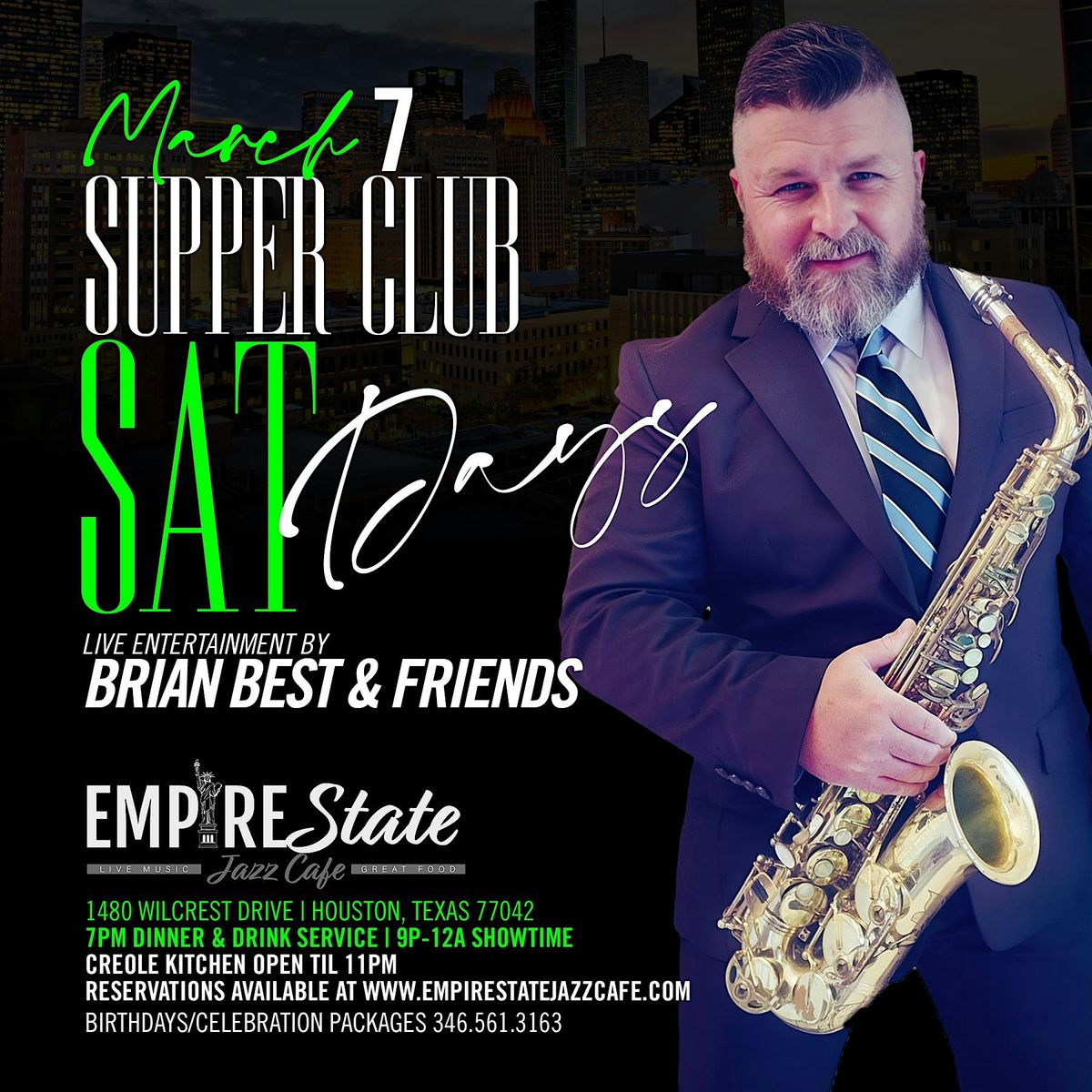 Welcome to **Supper Club Saturdays** at the Empire State Jazz Cafe! Join us on **March 7, 2026 at Doors 7:00 PM | Showtime 9:00 PM** for a night of amazing music with **Brian Best & Friends**. Get ready to groove to some fantastic tunes in a cozy and intimate setting. Don't miss out on this special evening filled with good vibes and great company. See you there!