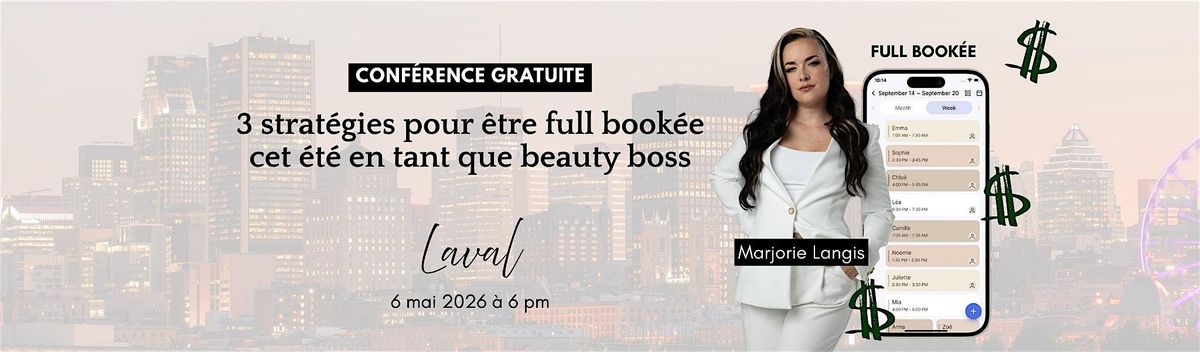Rejoins-nous le May 6, 2026 at 6:00 PM au Grand Hôtel Times Laval - Centropolis pour une soirée pleine de conseils pratiques et d'inspiration. Découvre comment booster ta carrière et devenir une Beauty Boss accomplie cet été. C'est l'occasion parfaite pour réseauter, apprendre et t'amuser dans une ambiance décontractée.