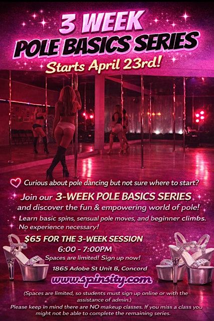 Ready to try something fun and challenging? Join our 3 week Pole Basic Series in person at SPIN SITY! Whether you’re a total beginner or just looking to brush up on your skills, this series is perfect for getting comfortable with the basics of pole dancing. Come hang out, get moving, and make some new friends while you’re at it. Don’t miss out on this awesome chance to learn and have fun! This class will meet each Thursdy from 6-7pm starting on 4/23 ( also meeting 4/30) and final class on May 7th.