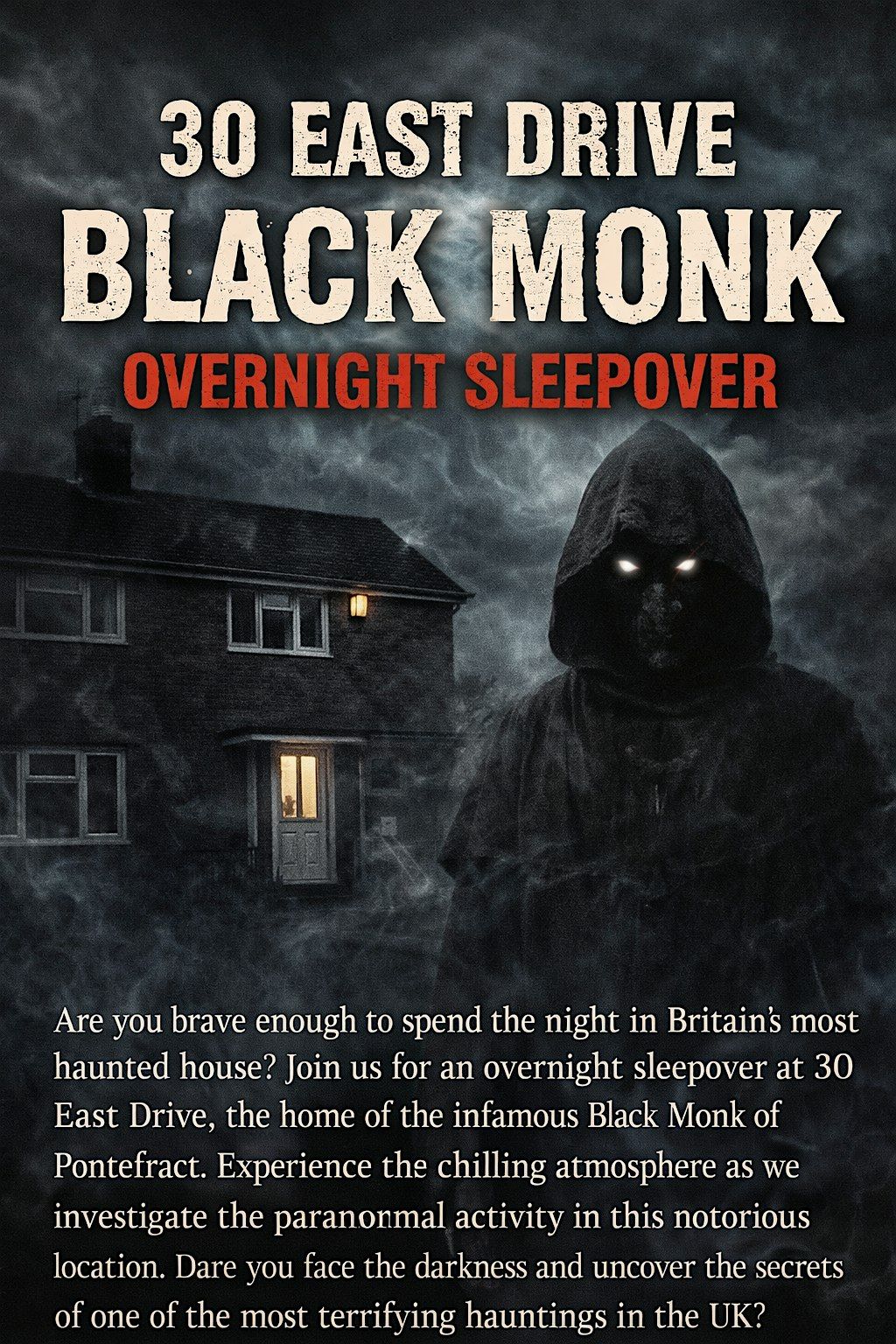 Get ready for a spine-chilling night at 30 East Drive, The Black Monk of Pontefract! Join us on March 23, 2026 at 8:00 PM (GMT) for an unforgettable overnight investigation into the legend of the Black Monk. Bring your curiosity and courage for a night full of mystery, stories, and maybe a few surprises. Don’t miss out on this unique experience! All you need is sleeping bag pillow and your courage. 16 plus is allowed must be accompanied with adult.