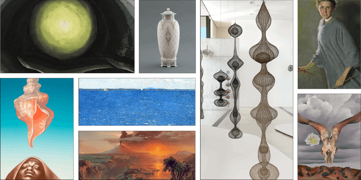 clockwise from top left: Arthur Garfield Dove, Moon, 1928, oil on board. Alfred Stieglitz Collection, co-owned by Fisk University, Nashville, TN and Crystal Bridges Museum of American Art, Inc., Bentonville, Arkansas; Adelaide Alsop Robineau, Scarab Vase (The Apotheosis of the Toiler), 1910, porcelain, 16⅝× 6 in. Everson Museum Permanent Collection. Photo: courtesy of Everson Museum; Ruth Asawa, Installation View of “Ruth Asawa: Life’s Work,” 2018 – 2019. Pulitzer Arts Foundation 2018. Photo: © Alise O’Brien Photography, © Estate of Ruth Asawa, courtesy of the Estate of Ruth Asawa and David Zwirner; Margaret Foster Richardson, A Motion Picture, 1912, oil on canvas, 40¾ × 23⅛ in. Pennsylvania Academy of the Fine Arts, Henry D. Gilpin Fund; Georgia O’Keeffe, Ram’s Head, White Hollyhock-Hills (Ram’s Head and White Hollyhock, New Mexico), 1935, oil on canvas, 30 × 36 in. Brooklyn Museum, bequest of Edith and Milton Lowenthal, 1992.11.28. Photo: Brooklyn Museum; Childe Hassam, West Wind, Isle of Shoals, 1904, oil on canvas, 15 × 22 in. Yale University Art Gallery, transfer from Beinecke Rare Book and Manuscript Library, Yale University Bequest of Sinclair Lewis to the Collection of American Literature; Frederic Edwin Church, Cotopaxi, 1862, oil on canvas, 48 × 85 in. Detroit Institute of Arts, Founders Society Purchase, Robert H. Tannahill Foundation Fund, Gibbs-Williams Fund, Dexter M. Ferry Jr. Fund, Merrill Fund, Beatrice W. Rogers Fund, and Richard A. Manoogian Fund; Charles White, Love Letter III, 1977, color crayon and spray paint lithograph printed in four colors and screenprint with gradated inking, 301⁄16 × 22⅝ in. Art Institute Chicago, Margaret Fisher Fund.