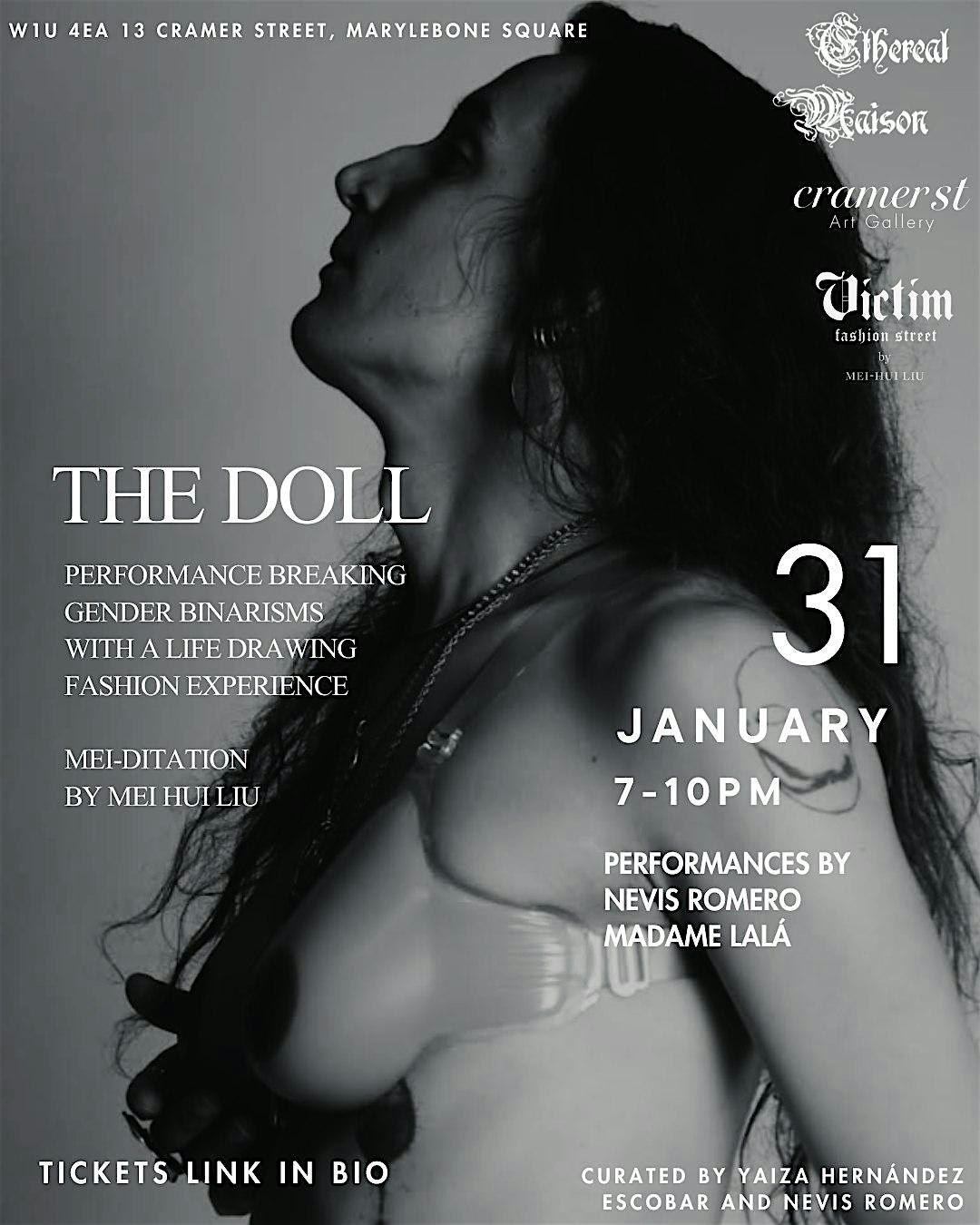 THE DOLL is an immersive performance-installation set inside a closet-like sculptural space built from Nevis Romero’s own garments, prosthetic forms and guest designers’ clothing racks.