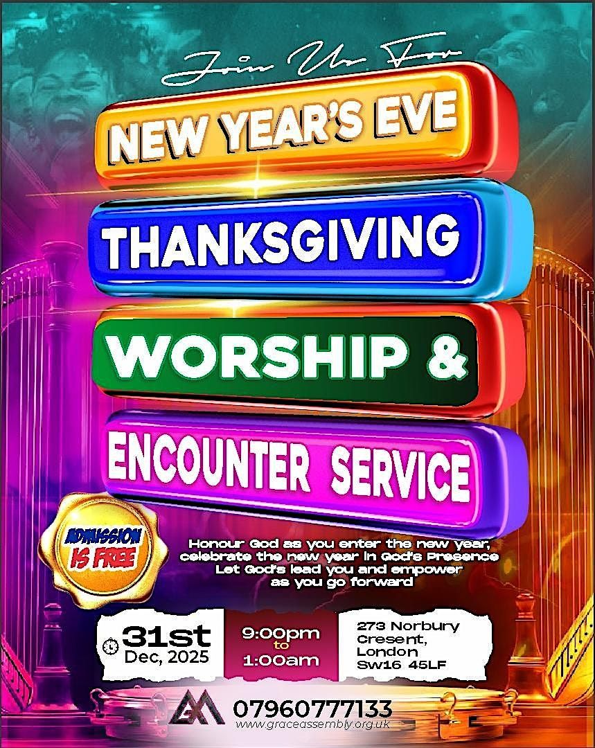 Come join us for a night of celebration and reflection as we give thanks for the past year, share stories of great things that God has done and worship God for His blessings. This event will be a time of encountering God's presence and seeking His guidance for the upcoming year.