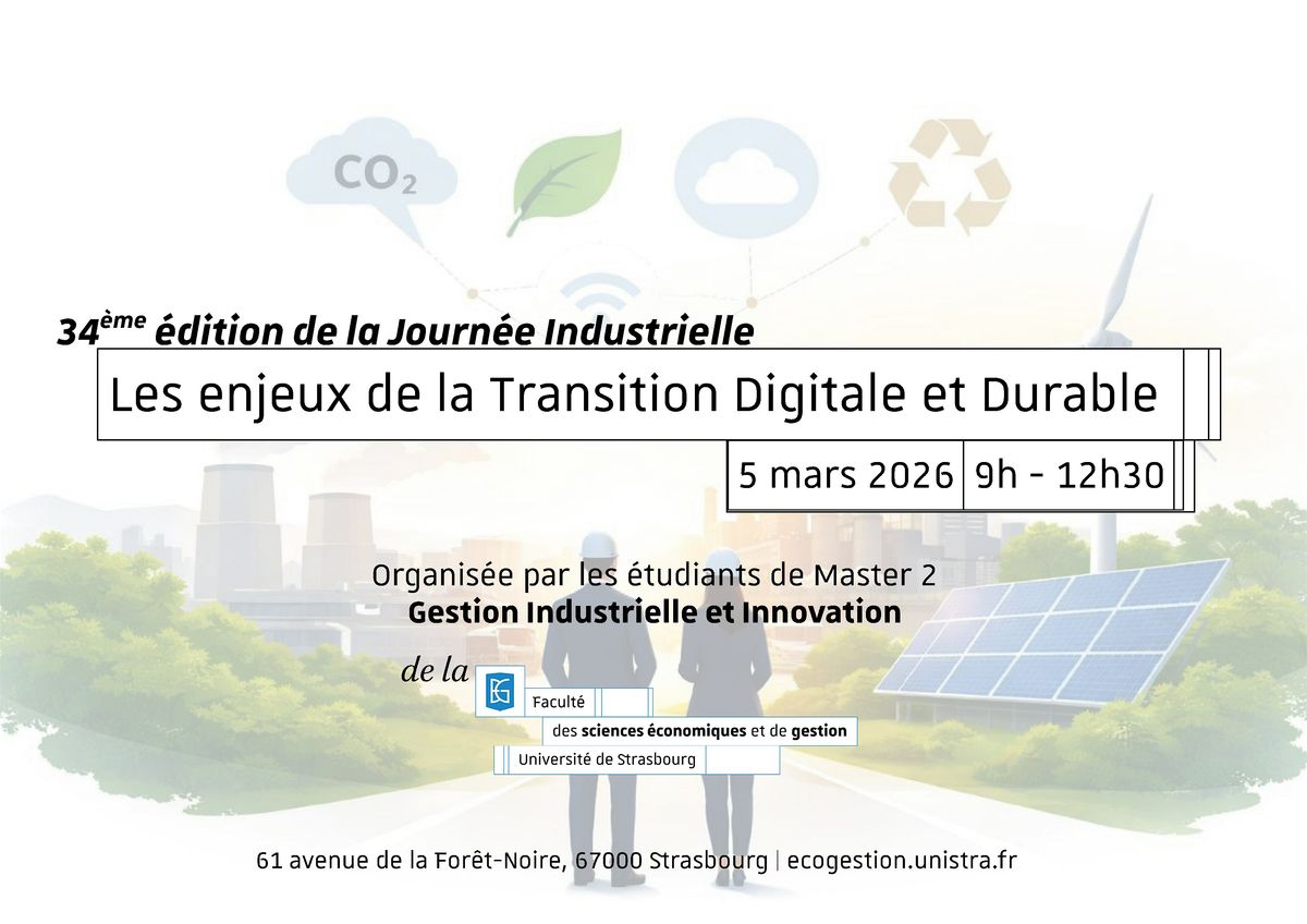Le 5 mars 2026, de 8h30 à 12h00, se tiendra la 34ème édition de la Journée Industrielle sur le thème « Les Enjeux de la Transformation digitale et durable », organisée par la Faculté des Sciences Economiques et de Gestion de l’Université de Strasbourg. Au programme, des interventions ayant pour ambition de réunir acteurs industriels, experts et décideurs afin de partager des retours d’expérience concrets, décrypter les leviers de performance et échanger autour des défis opérationnels rencontrés sur le terrain.
