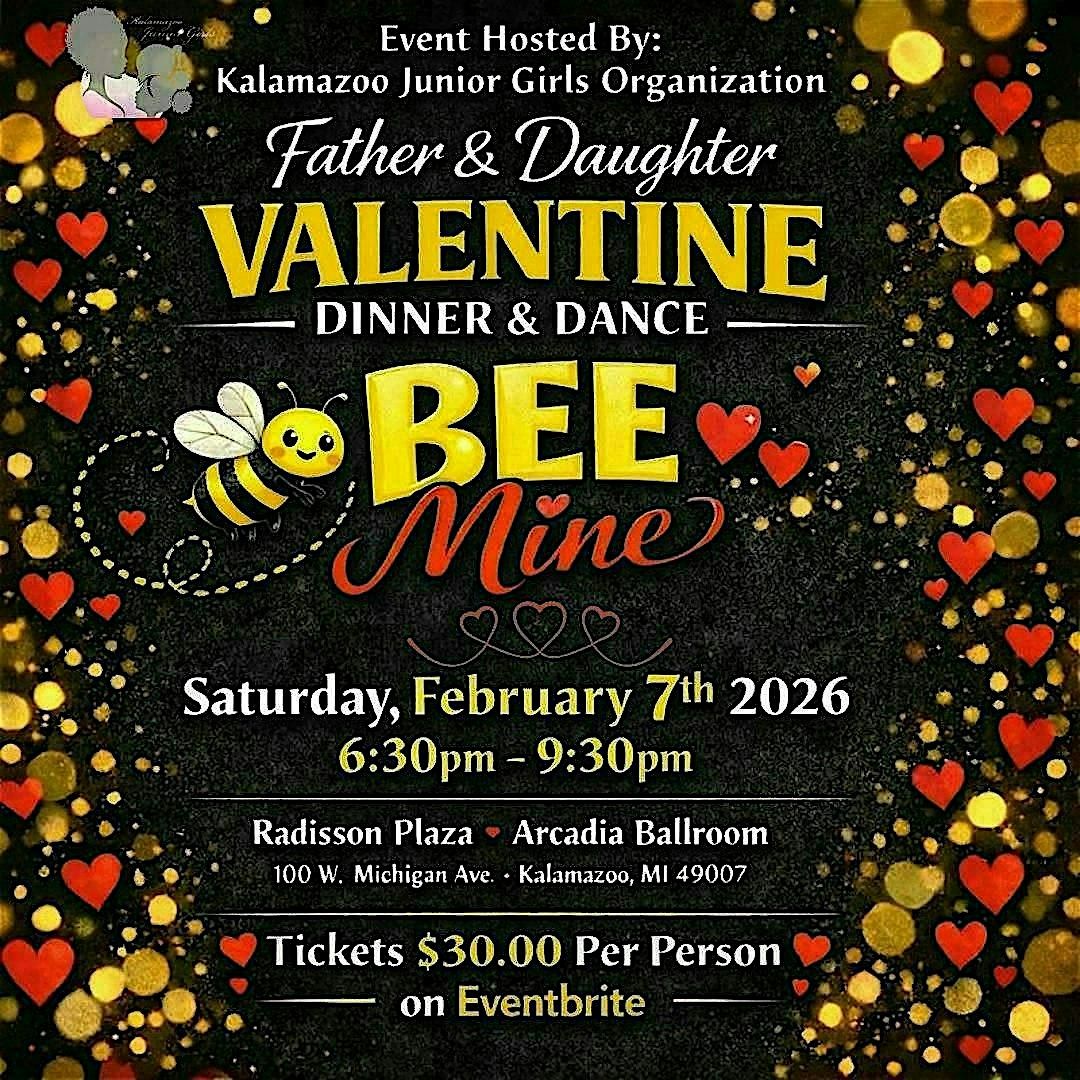 Join us for the 34th Annual Father & Daughter Valentine Dinner & Dance, hosted by the Kalamazoo Junior Girls Organization! 💛🐝 This enchanting evening, themed “BEE Mine”, is a celebration of the special bond between father's and/or male chaperones for girls up to 18 years old. Enjoy a night filled with dinner, dancing, laughter, and unforgettable memories in a beautifully decorated ballroom at the Radisson Plaza Hotel, styled in our festive black, yellow, white, and red color scheme. Come dressed in your finest attire and let your style shine on the ballroom dance floor. Tickets are $30 per person and available only on Eventbrite. Don’t miss this magical evening of love, connection, and fun. It’s the perfect way to celebrate Valentine’s Day with your princesses!
