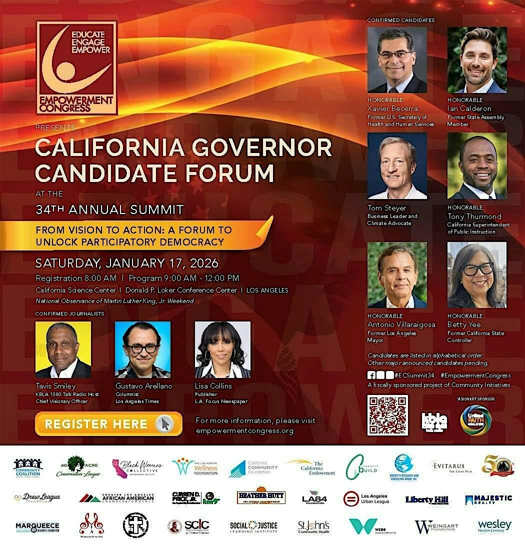 Held in observance of Martin Luther King Jr. Day, the 34th Annual Empowerment Congress Summit features a nonpartisan California Governor Candidate Forum moderated by Tavis Smiley (KBLA Talk 1580), with questions posed by journalists Gustavo Arellano (LA Times) and Lisa Collins (LA Focus). The program follows a structured agenda focused on issue-based public dialogue.