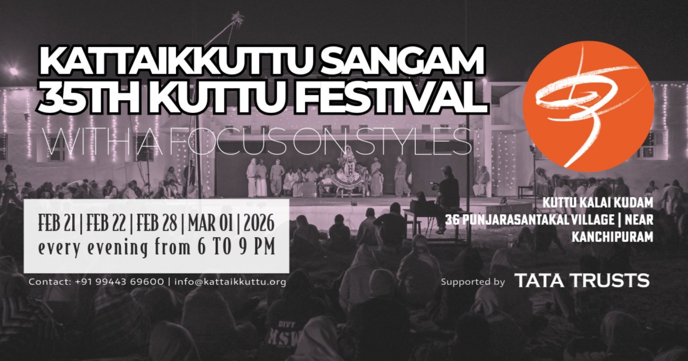 The 35th Performing Arts Festival organized by the Kattaikkuttu Sangam this year will take place over 4 days | 2 weekends and will focus on different performances styles within the Kattaikkuttu theatre. 8 companies will perform.