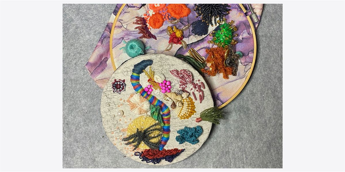 Learn to execute a wondrous coral reef embroidery from concept design to finished product ready for display. Week 1 will focus on exploring design concepts, sketching out ideas, and transferring your final design sketch to your fabric. Then you will learn how to turn 5 needle weaving techniques into 8 different types of elements. Week 2 will focus on beaded embroidery techniques, where you will learn how to combine different bead types and techniques to create several types of anemones, corals, and background elements. In Week 3 we will go back to embroidery floss to learn how to continue fleshing out our design with 17 new techniques. Week 4 will have you adding your final embellishments and allow you to catch up on any techniques we couldn’t get to in Weeks 1-3. You will then learn 3 ways to turn your embroidery into a finished piece ready to display. Join us on this underwater adventure you won’t want to miss!