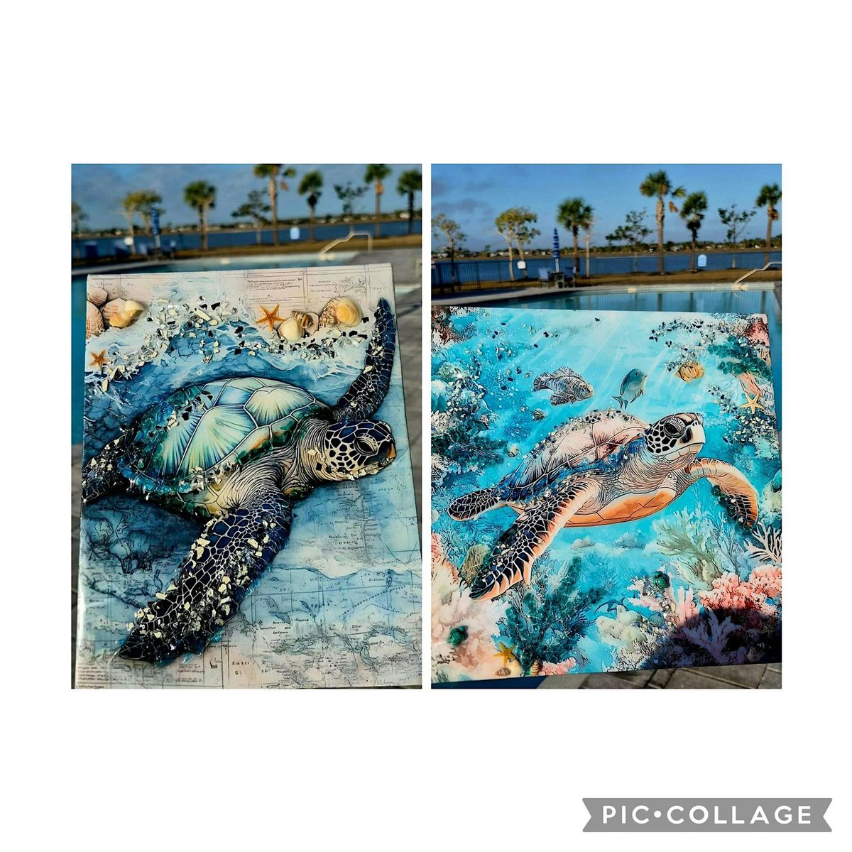 Pictures can't even begin to do justice to how beautiful this art is. This is a printed canvas that you will embelish with crushed glass and then really add the special touch of resin overtop making this piece of art POP off the wall with a 3-D effect. Simple and easy for all ages and skill levels. Turtle swimming canvas measures 14 x 14 --- and the Turtle on the shore with map measures 11 x 15. Summer is around the corner and this will add a touch of warmth to your home. Choose your design option at checkout. Pre-registration is required.