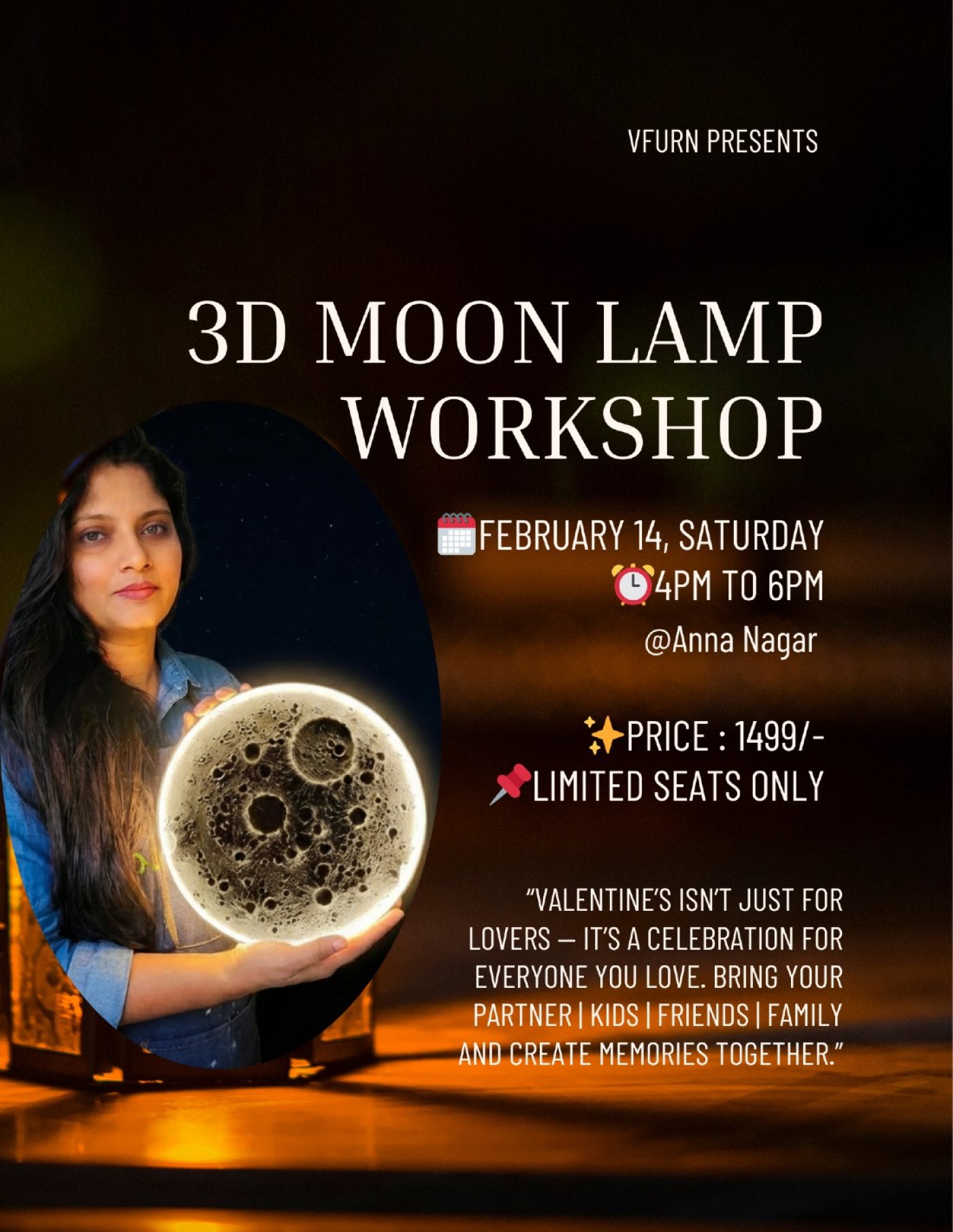 #MoonLampWorkshop #ValentinesWorkshop #ChennaiEvents #VFurnEvents #CraftWorkshop #FamilyTime #CoupleActivities #KidsWorkshop #DIYMoonLamp #ArtWithLove #CreateMemories