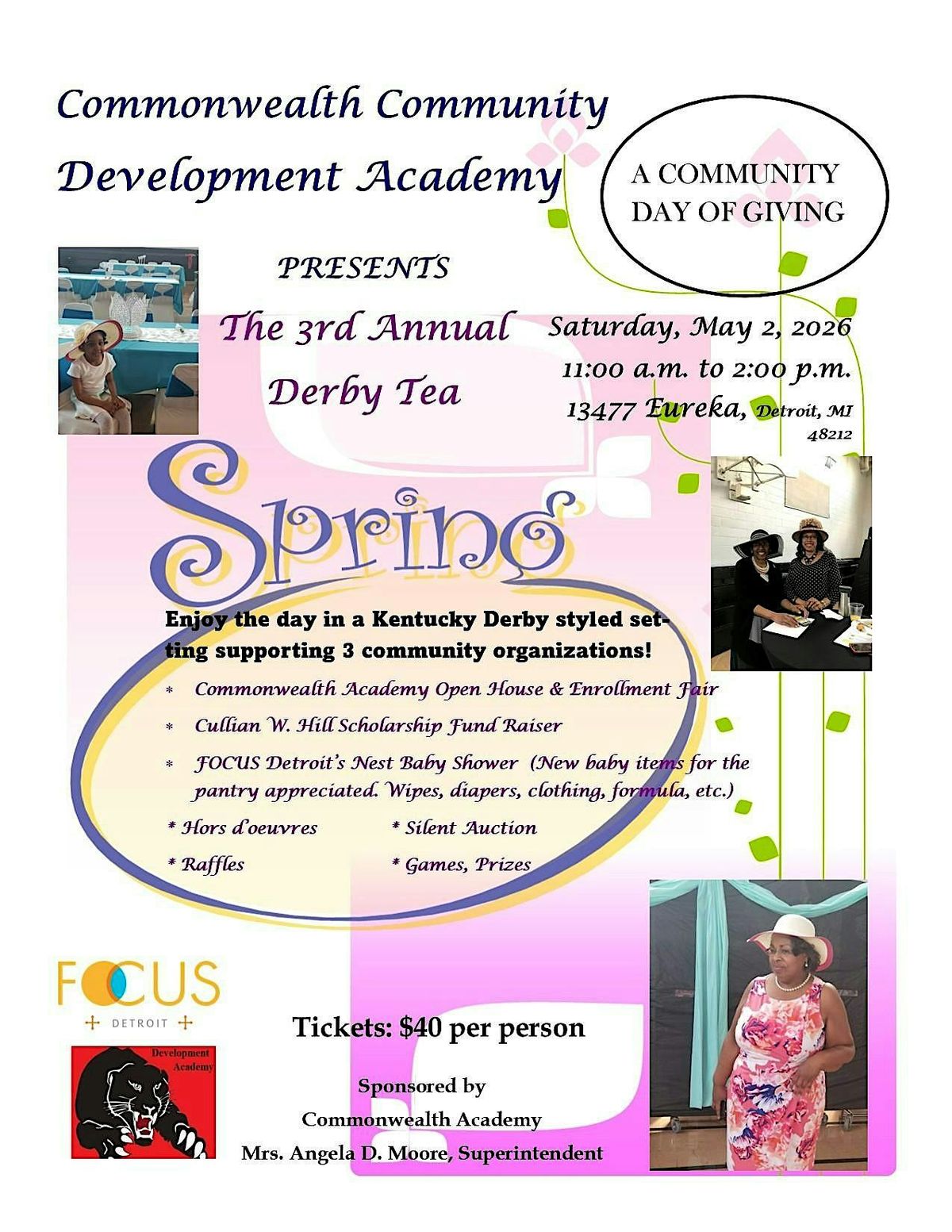 A Kentucky Derby styled setting supporting 3 community organizations!Commonwealth Academy : FOCUS Detroit : C W Hill Scholarship Foundation
