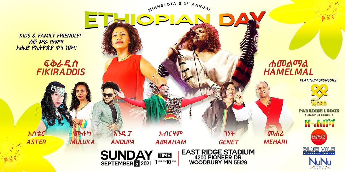 ሰኞ ሥራ የለም; እሁድ የኢትዮጵያ ቀን ነው!!Enjoy the last days of summer at the 3rd Annual Ethiopian Day Festival of Minnesota 2021 Fun & family friendly including live music, soccer match, food, traditional coffee/buna ceremony, art, faceprinting, merchandise, kids games & Activities and much more!The live music lineup includes ፍቅራዲስ FikirAddis, ሐመልማል Hamelmal, አስቴር Aster, አብርሃም Abraham, መሐሪ Mehari, አንዱፓ Andupa, ገነት Genet, ሙሉካ Muluka alongside ከሰላም ባንድ ጋር Selam Band.#EthiopianDayFest #LaborDayWeekend #EventsInMinnesota #SummerFun #LastDaysOfSummer #FestivalsInMinnesota #Minnesota #FamilyFun #Ethiopia Ethiopian Day Festival of Minnesota is Proudly Presented by Zehabesha & Concept Designs: Printing, Design & Tech Support
