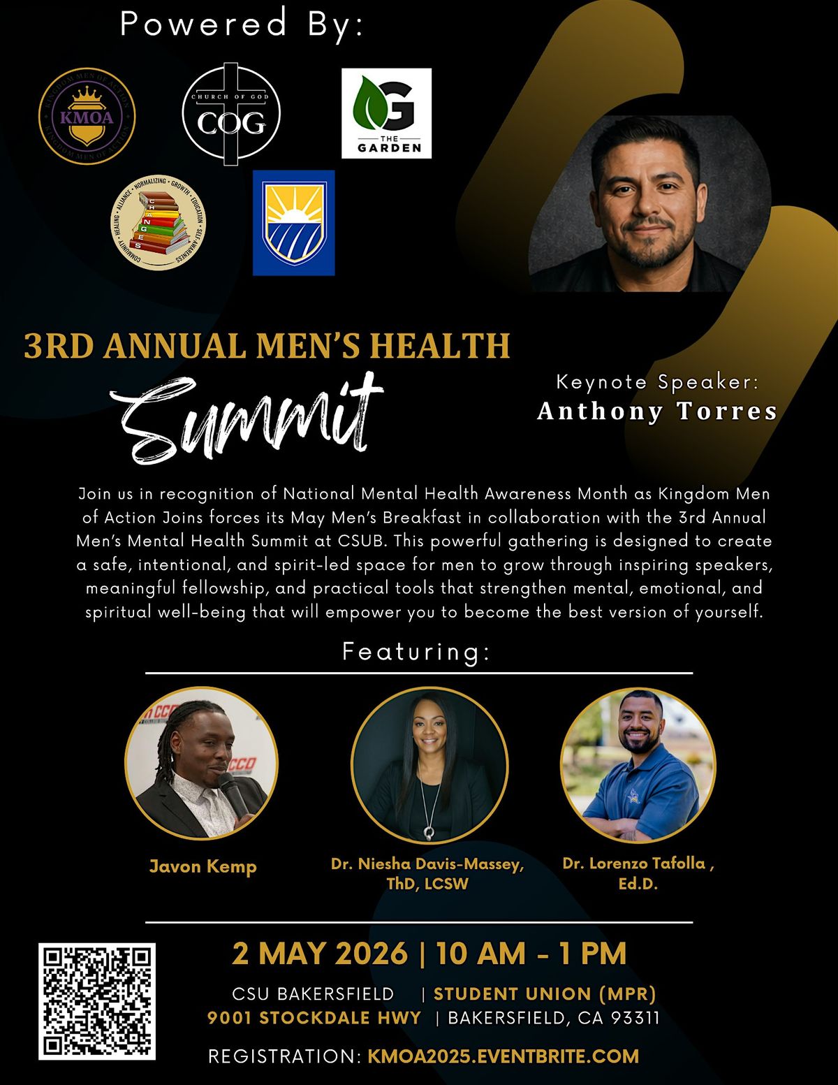 Join us for the 3rd Annual Men’s Health Summit at CSU Bakersfield in recognition of National Mental Health Awareness Month. This powerful gathering brings together Kingdom Men of Action, Church of God, The Garden, and community partners to create a space for growth, connection, and transformation.