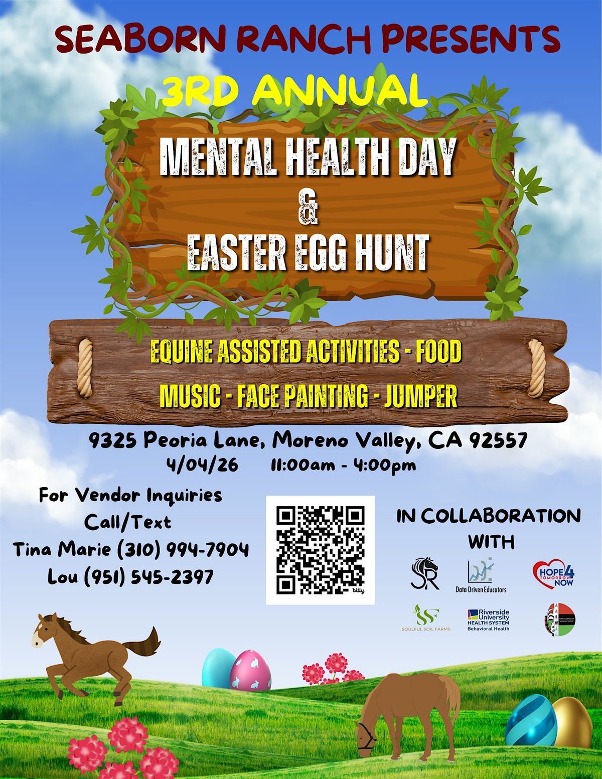 Join us for the 2nd Annual Mental Health Day at the Ranch on April 4, 2026, from 11 AM to 4 PM at SEABORN Ranch in Moreno Valley. This family-friendly event promotes wellness and community connection with an Easter egg hunt, face painting, live music, a jumper for kids, delicious food, and more. Nonprofit vendors can participate for free, while for-profit vendors require a booth fee. Don't miss this opportunity to relax, recharge, and enjoy a day of fun and support. Free entry – all are welcome!