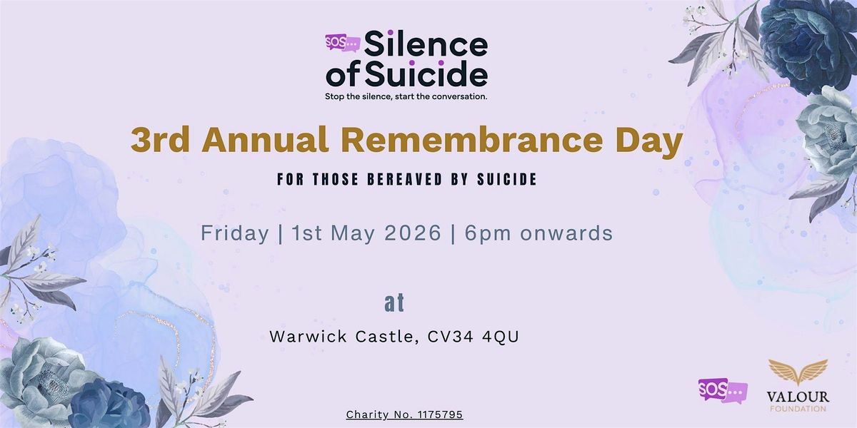 SOS Silence of Suicide warmly invites you to the Third Annual Evening of Remembrance for those bereaved by suicide, taking place on Friday, 1st May 2026, 6pm onwards.