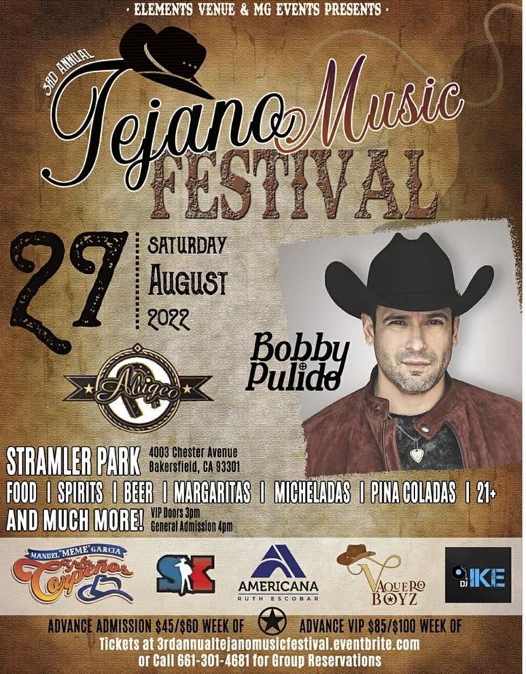 Elements Venue & MG Events Presents "3rd Annual Tejano Music Festival" w/Bobby Pulido, Sat August 27, 2022 at Stramler Park 4003 Chester Ave Bakersfield, CA 9330121+, Security, VIP Doors 3pm, General Admission Doors 4pm