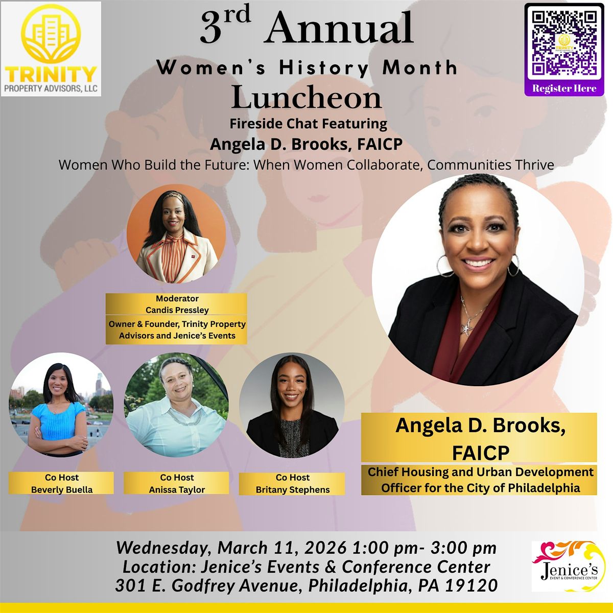 Join us for an inspiring afternoon celebrating Women’s History Month at the 3rd Annual Women’s History Month Luncheon, presented by Trinity Property Advisors, LLC and hosted at Jenice’s Event & Conference Center.