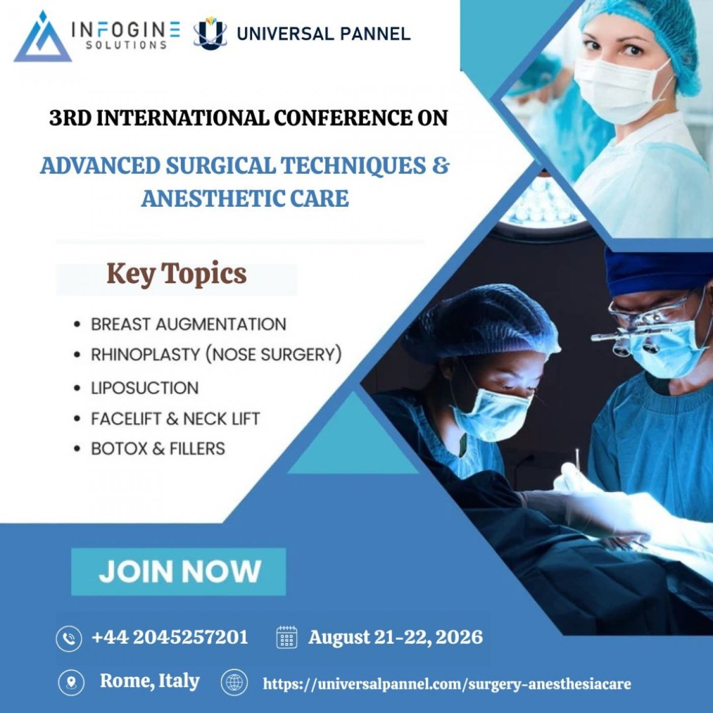 Embrace the opportunity to be at the forefront of progress and join us at the 3rd International Conference on Advanced Surgical Techniques & Anesthetic Care. Let's redefine the future of healthcare together.