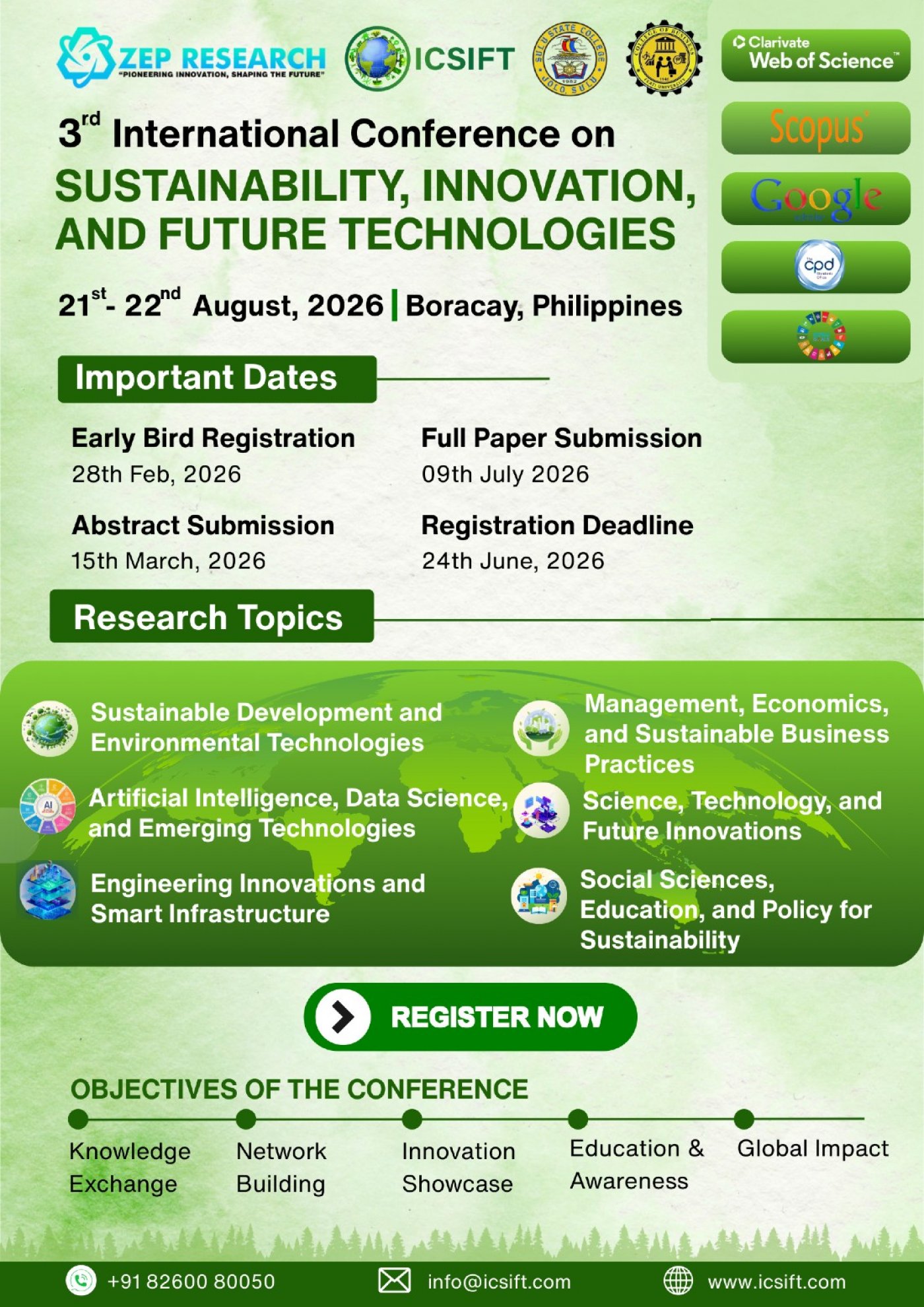 The 3rd International Conference on Sustainability, Innovation, and Future Technologies 2026, taking place in the vibrant city of Boracay, Philippines, aims to engage in discussions and identify how and where sustainability, technological innovation, and industrial futures intersect.
