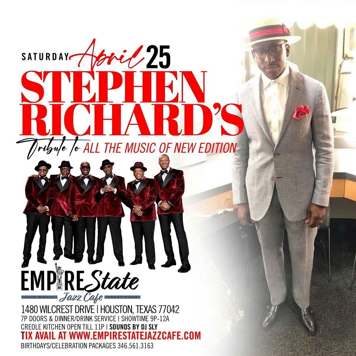 Welcome to the Empire State Jazz Cafe for a special evening on 4/25 - Stephen Richard Saturday Tribute to New Edition! Join us on April 25, 2026 at Doors 7:00 PM | Showtime 9:00 PM for a fantastic tribute event. Let's celebrate the music of New Edition together at this amazing venue. Don't miss out on this one-of-a-kind experience!